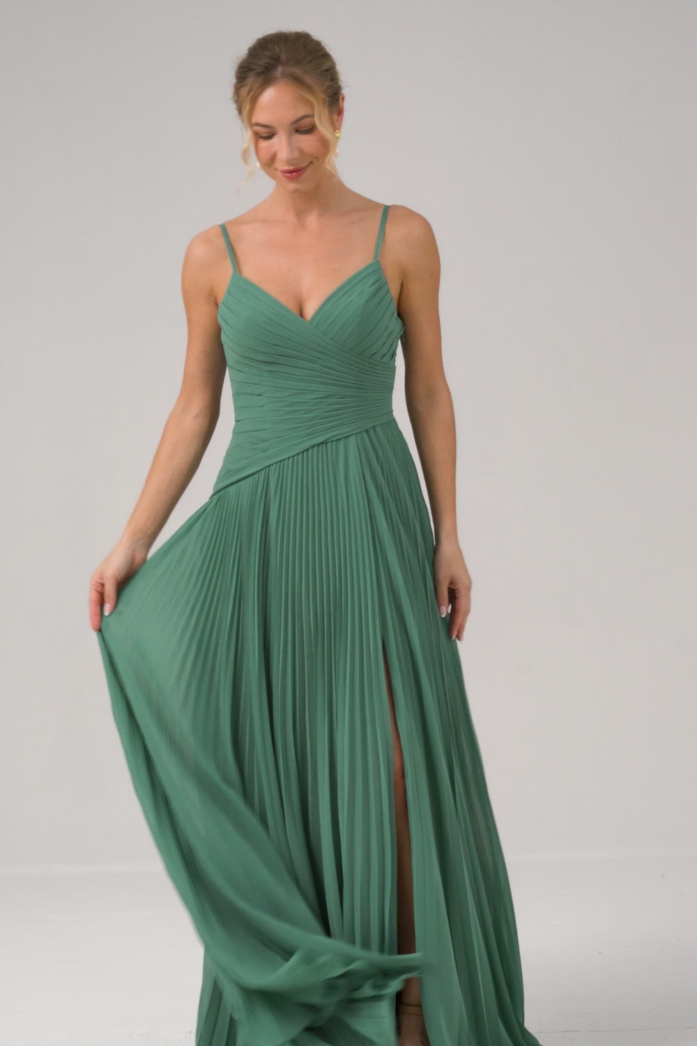 Eukalyptus A-linje Spaghetti remmar veckad chiffong brudtärna klänning med slits