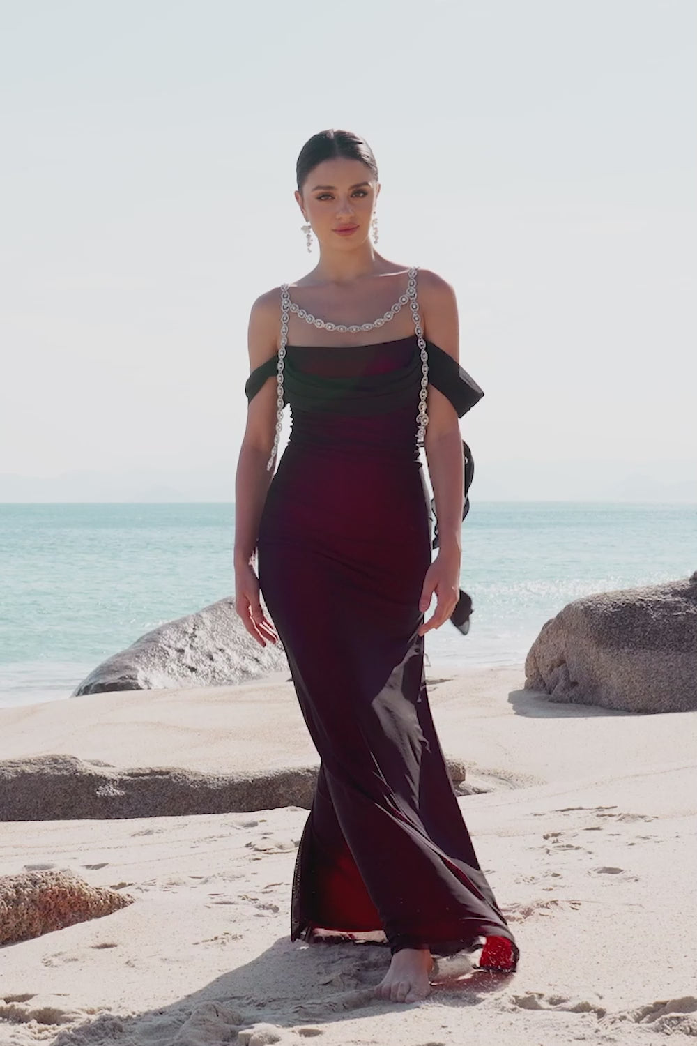 Glittrande Svart Röd Mermaid Cold Shoulder Lång Brudtärneklänning