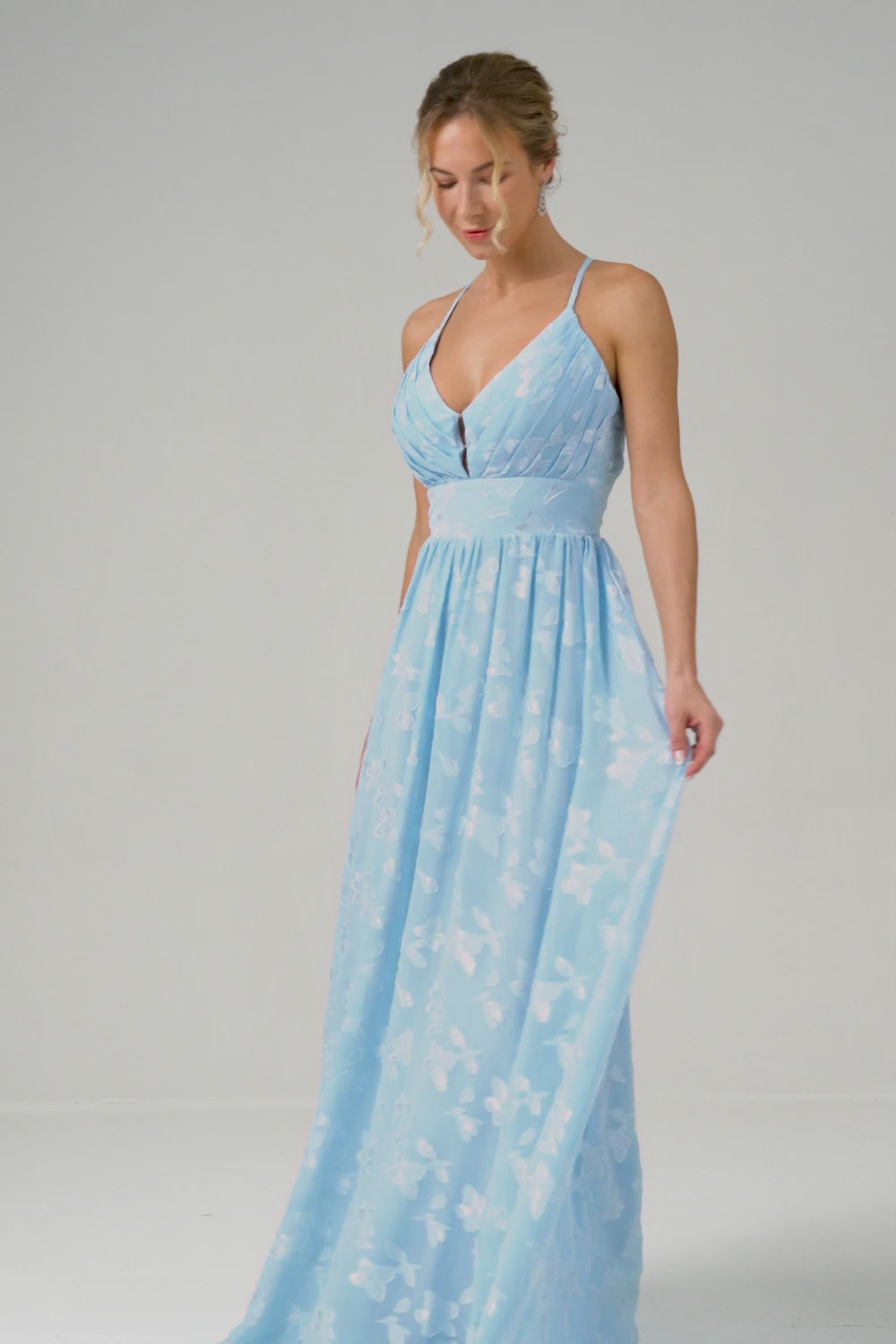 Glittrande V-ringad veckad ljusblå lång brudtärneklänning med broderi