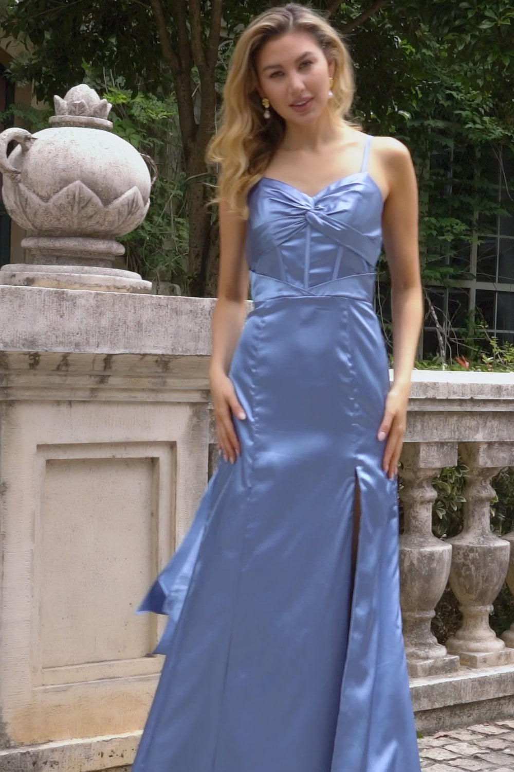 Grå Blå Mermaid Spaghetti Straps Lång Satin Brudtärneklänning med slits