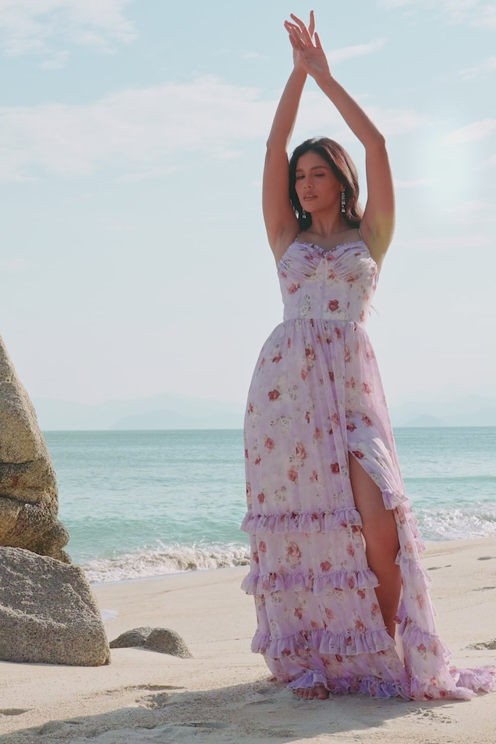 Grå Lila Blommig Korsett A Line Spaghetti Remmar Brudtärna Klänning med slits