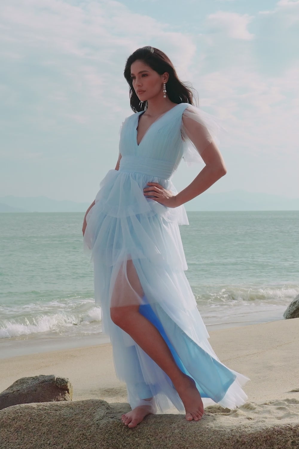 Gråblå A-linjeformad V-ringad Tyll Lång Tiered Brudtärna Klänning med Slits