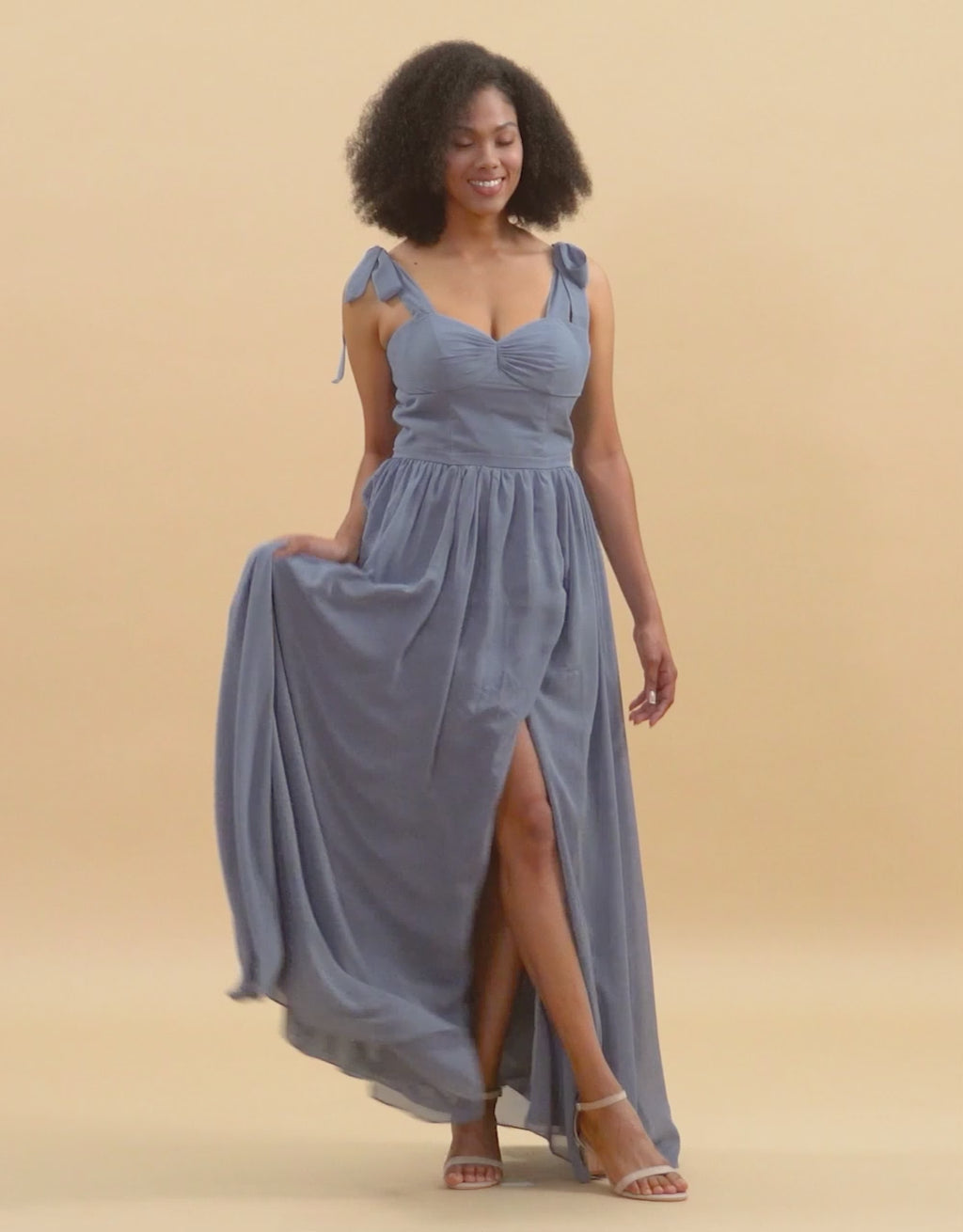 Gråblå Smala Axelband Lång Chiffong Brudtärneklänning Med Slits