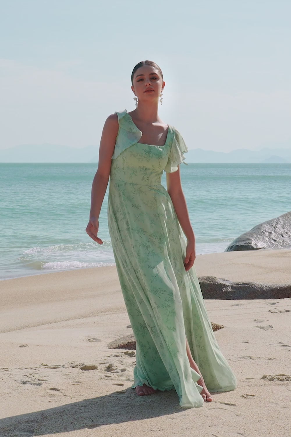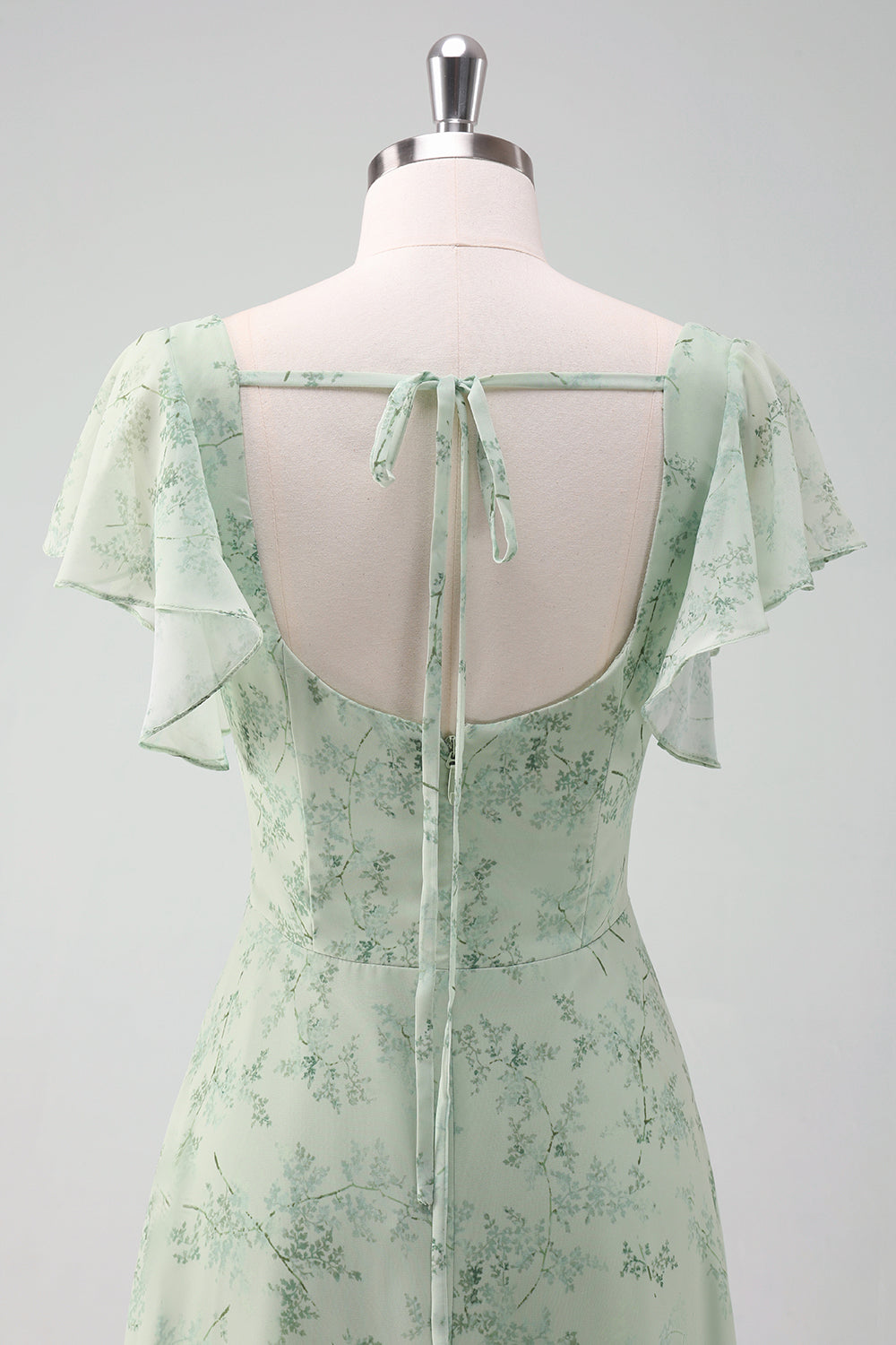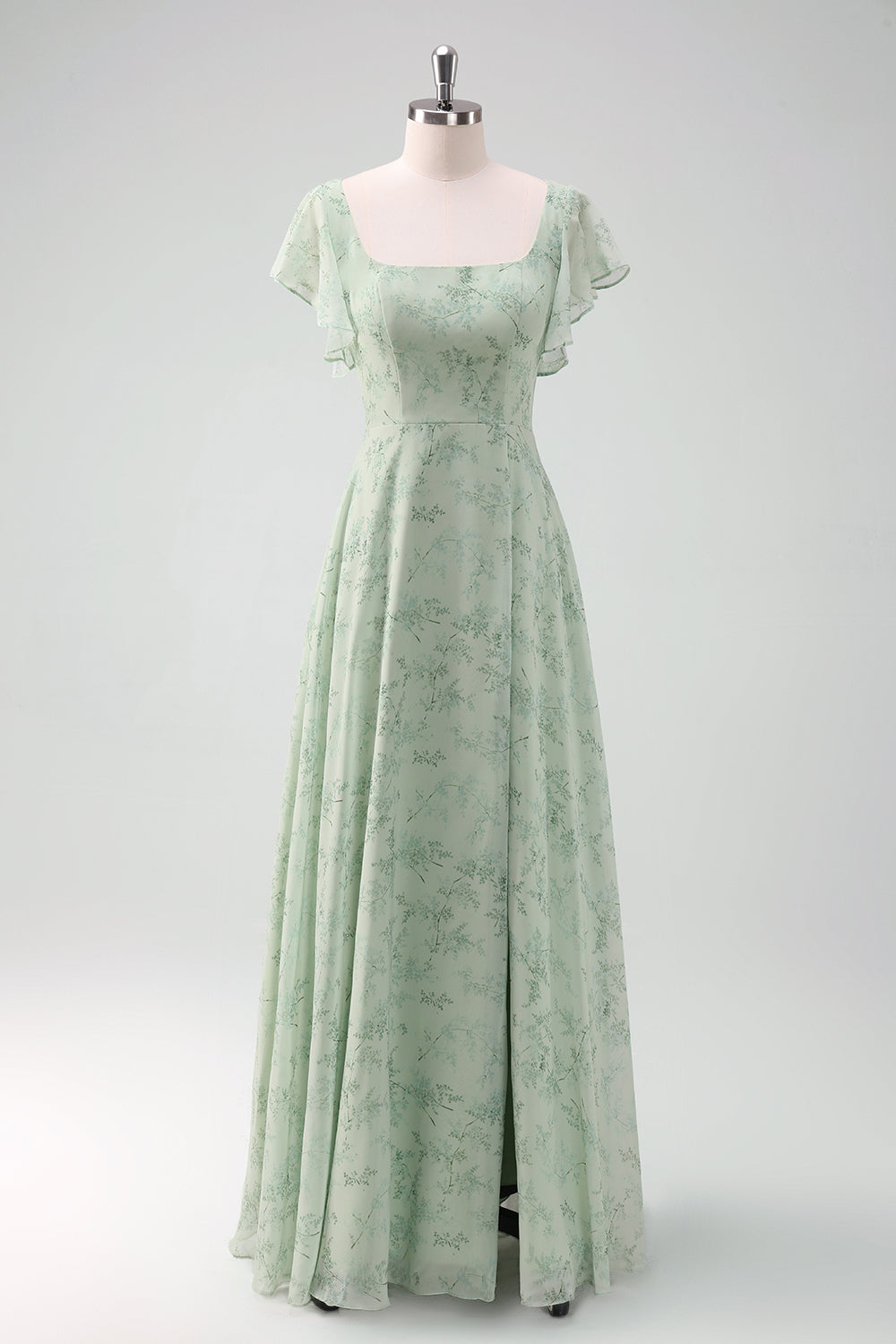 Dusty Sage Kall Axel Sammet Tryckt Brudtärna Klänning med Slits