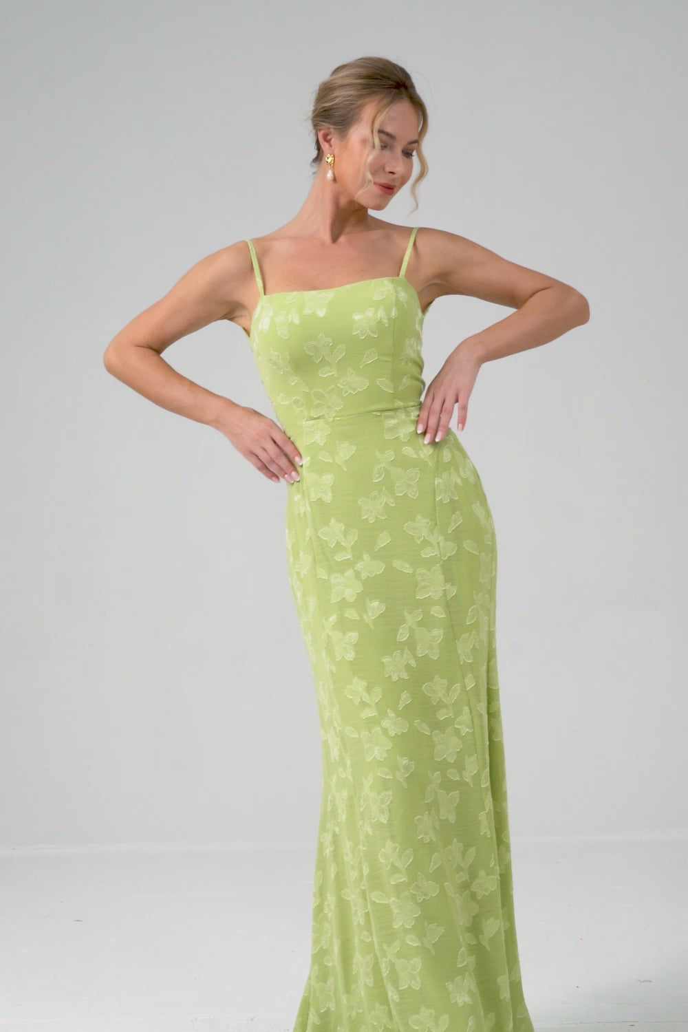 Grön sjöjungfru Spaghetti remmar Broderad brudtärna klänning med snörning upp tillbaka