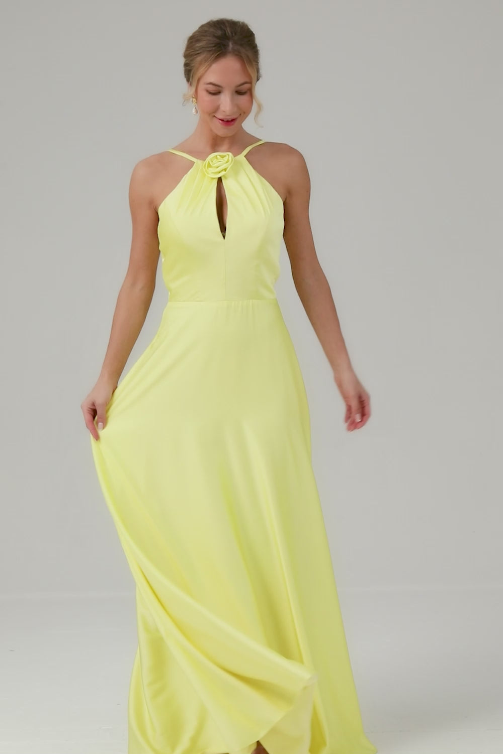 Gul En Linje Halter Cut Out Backless Lång Brudtärna Klänning Med Blomma