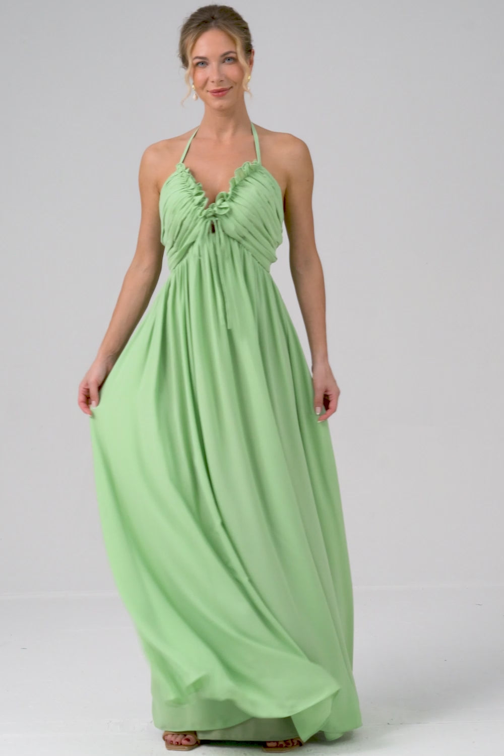 Ljusgrön A Line Halter Backless Lång Brudtärna Klänning med Snörning Upp Tillbaka