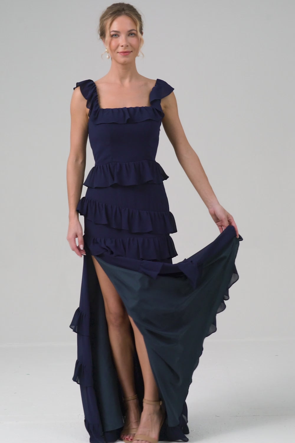 mörk marin A-linje nivåer chiffong lång brudtärna klänning