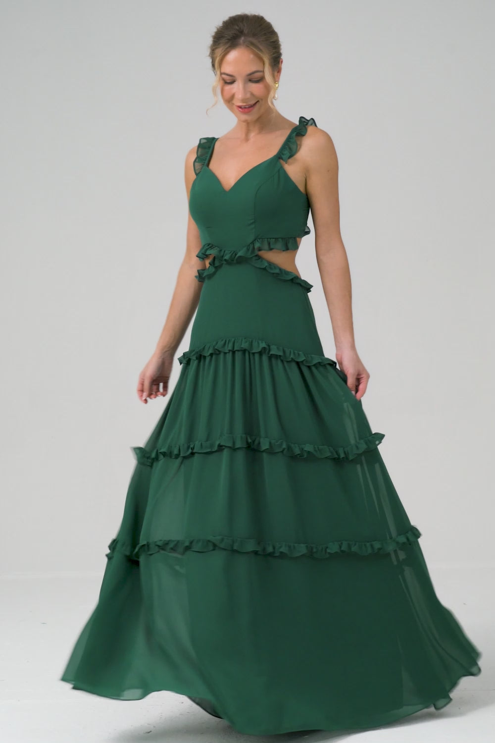 Mörkgrön A-linje Ihålig Ut Volang Lång Brudtärna Klänning