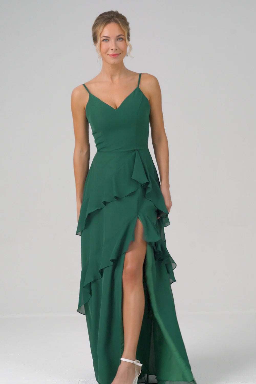 Mörkgrön A-linje Spaghetti Straps Chiffong Lång Brudtärna Klänning med Volanger
