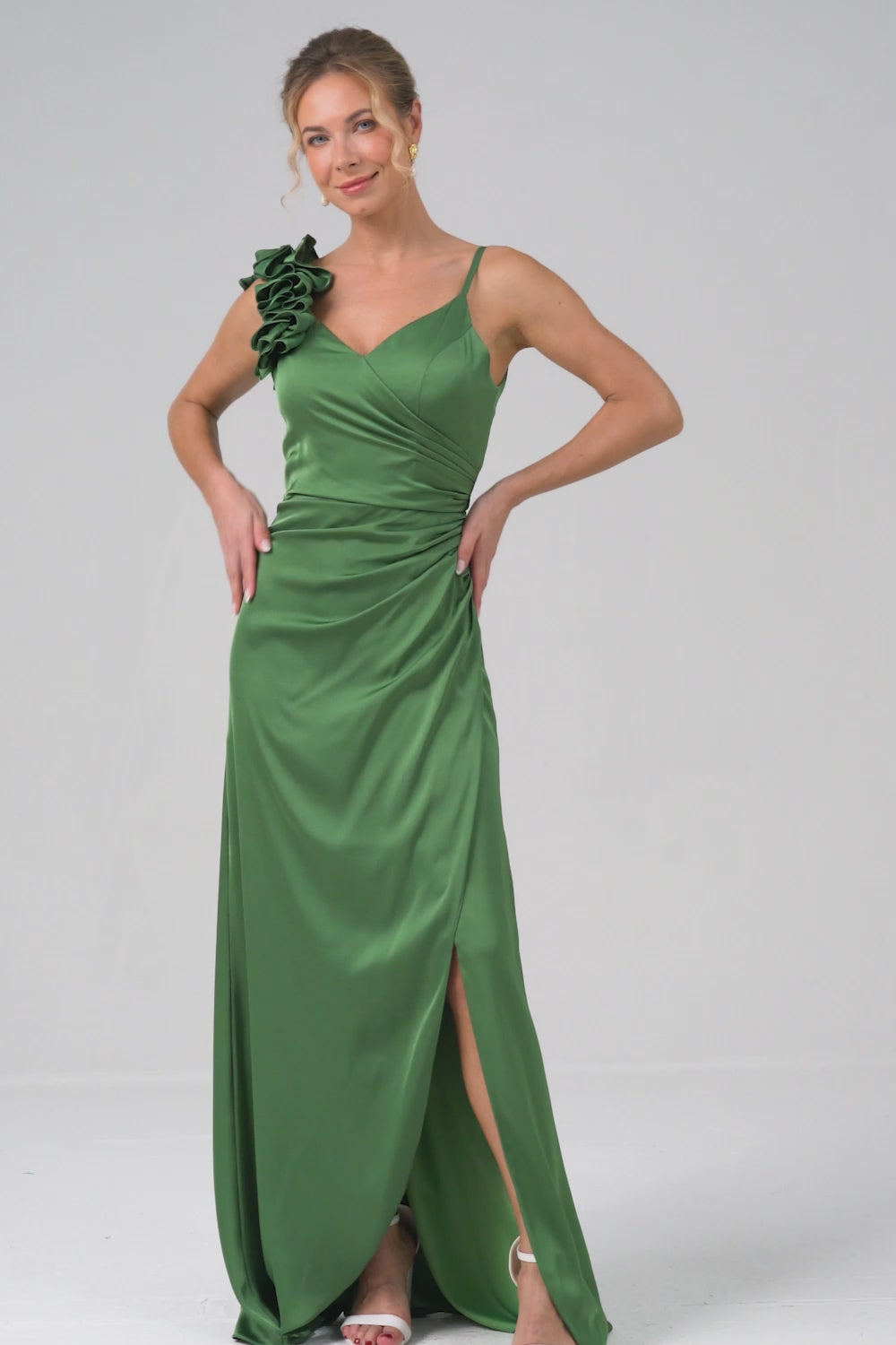Olivgrön Slida Plisserad Satin Lång Brudtärna Klänning med Slits