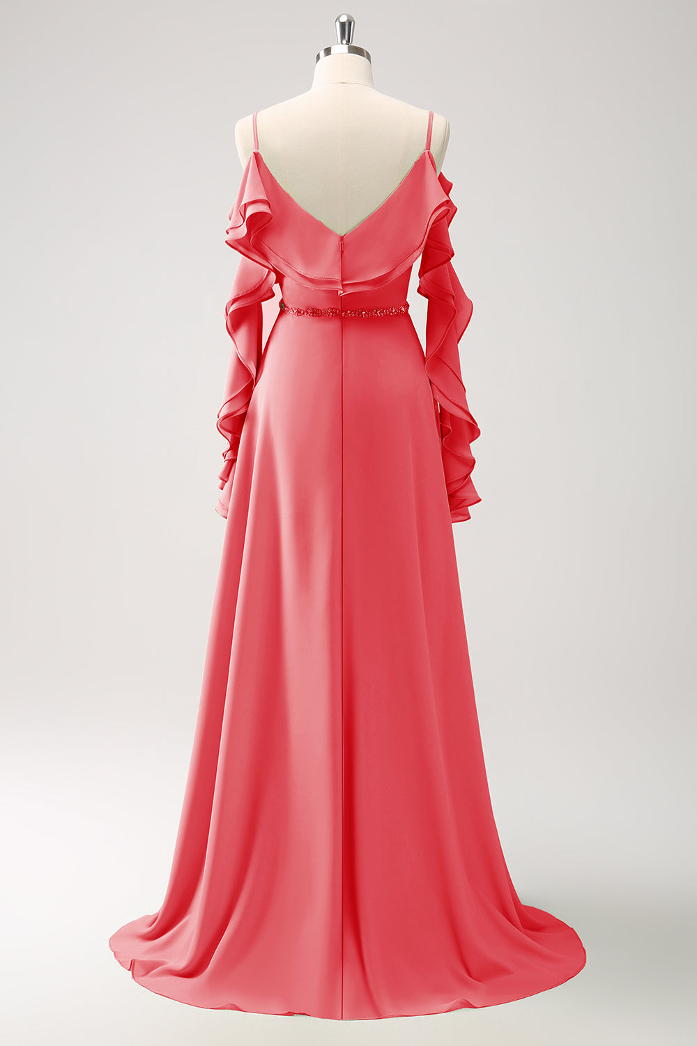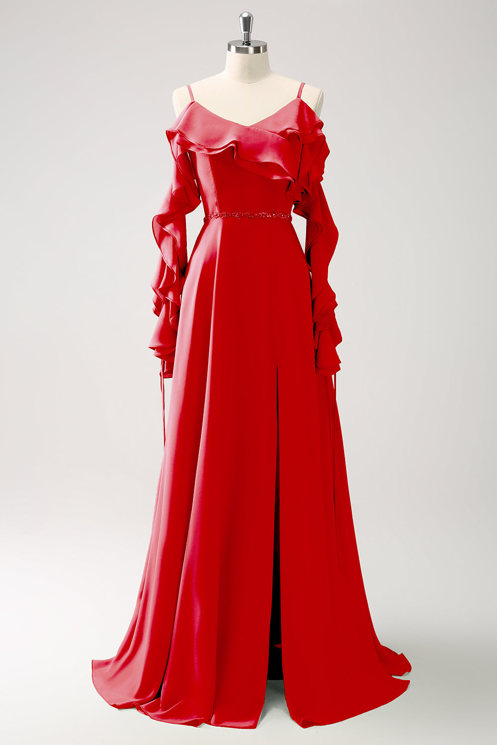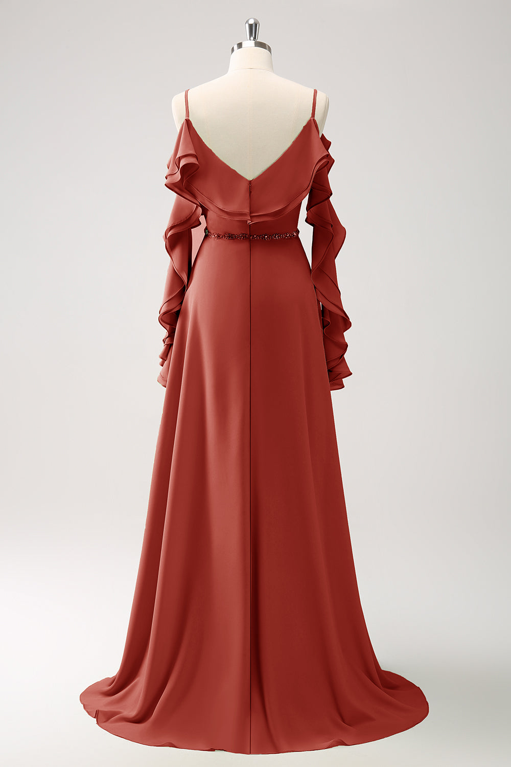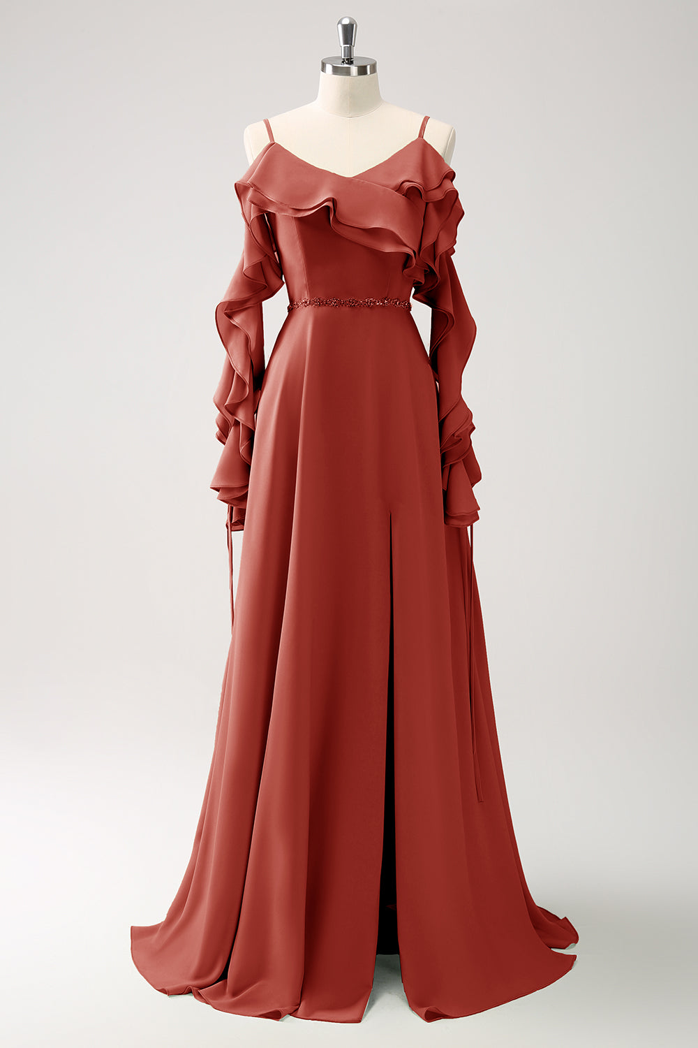 Röd Kall Axel A-linje Chiffong Lång Brudtärna Klänning med Volanger