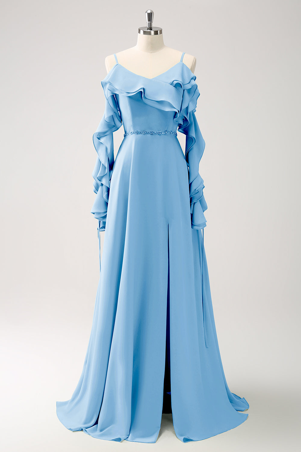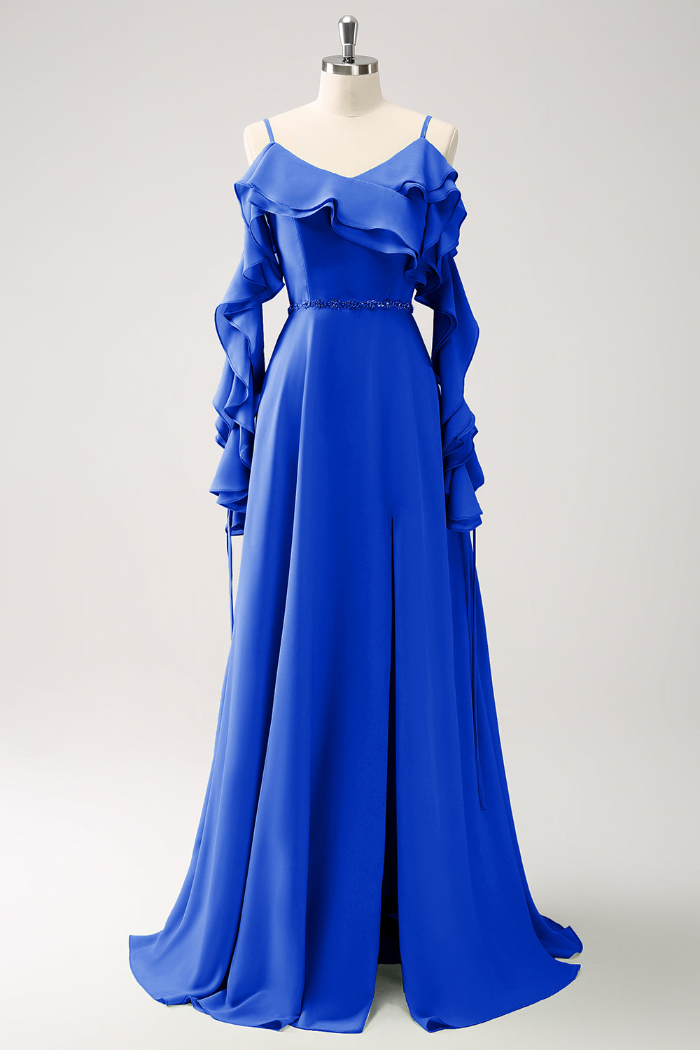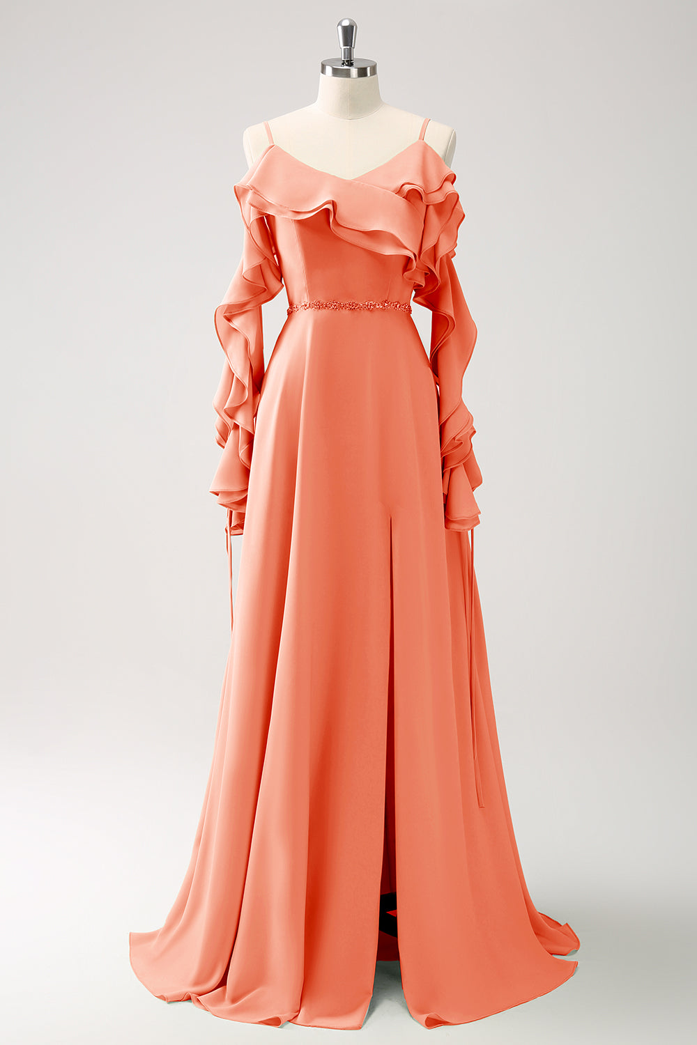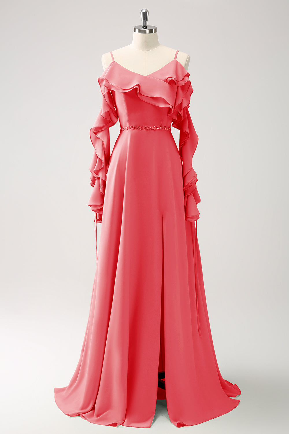 Röd Kall Axel A-linje Chiffong Lång Brudtärna Klänning med Volanger