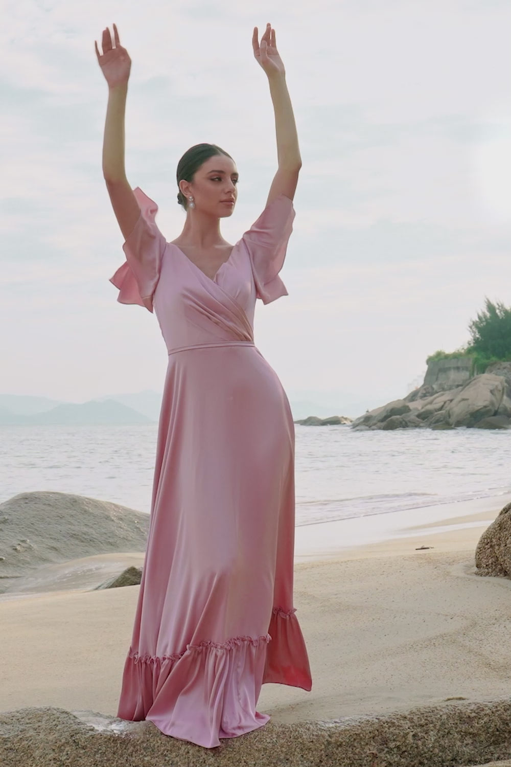 Rosa A-linje Ruffle Wrap Korta ärmar Lång Satin Brudtärna Klänning