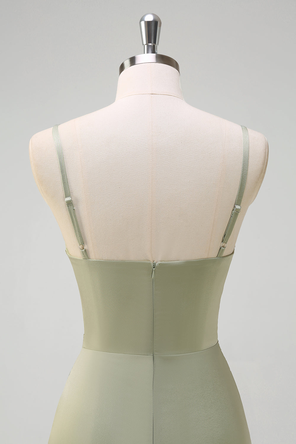 Salvia Sjöjungfru Spaghetti Remmar Rynkad Satin Brudtärna Klänning med Slits