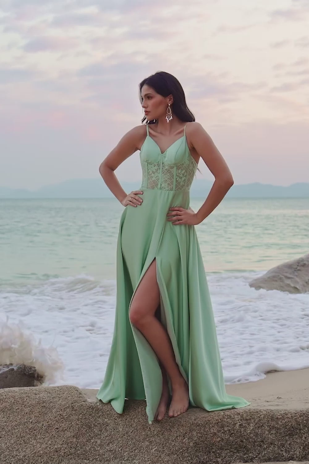 Satin Grön A-linje Korsett Brudtärna Klänning med slits
