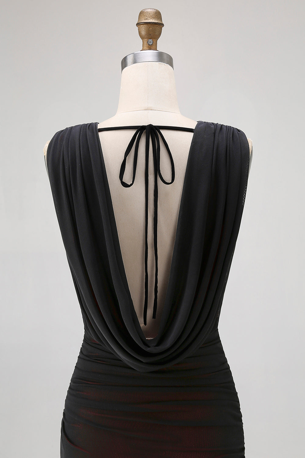 Slida Cowl Neck Svart Röd Lång Brudtärna Klänning med Slits