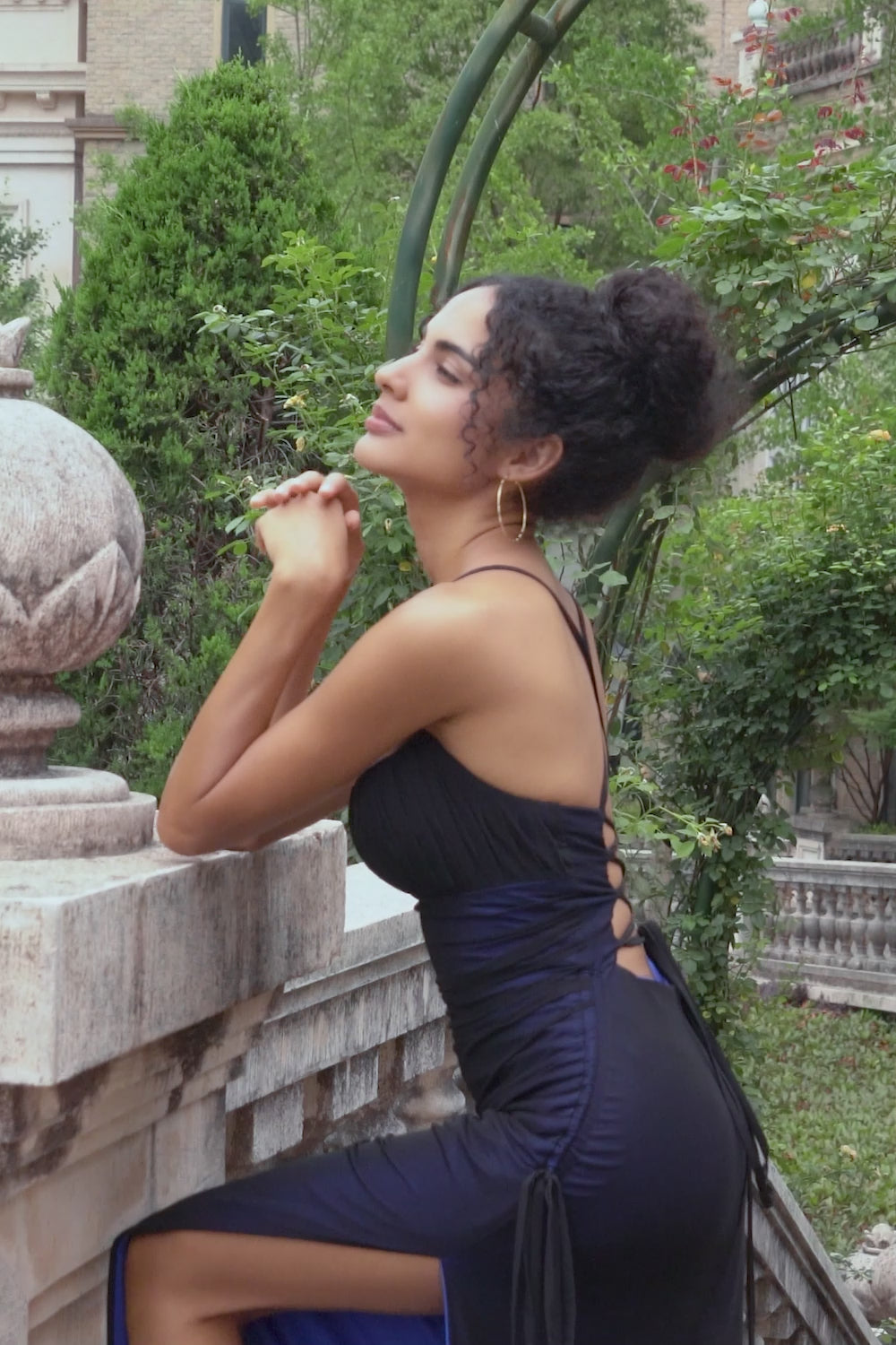 Svart Blå Spaghetti Straps Mermaid Plisserad Lång Balklänning med Slits