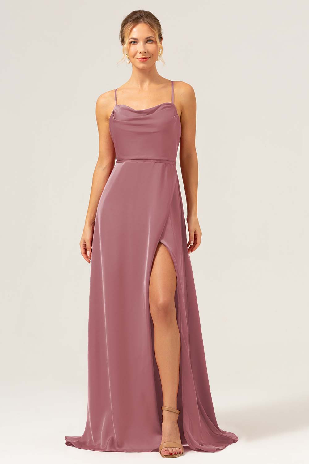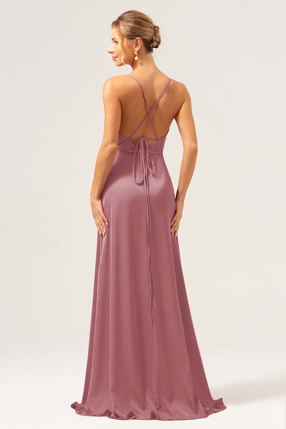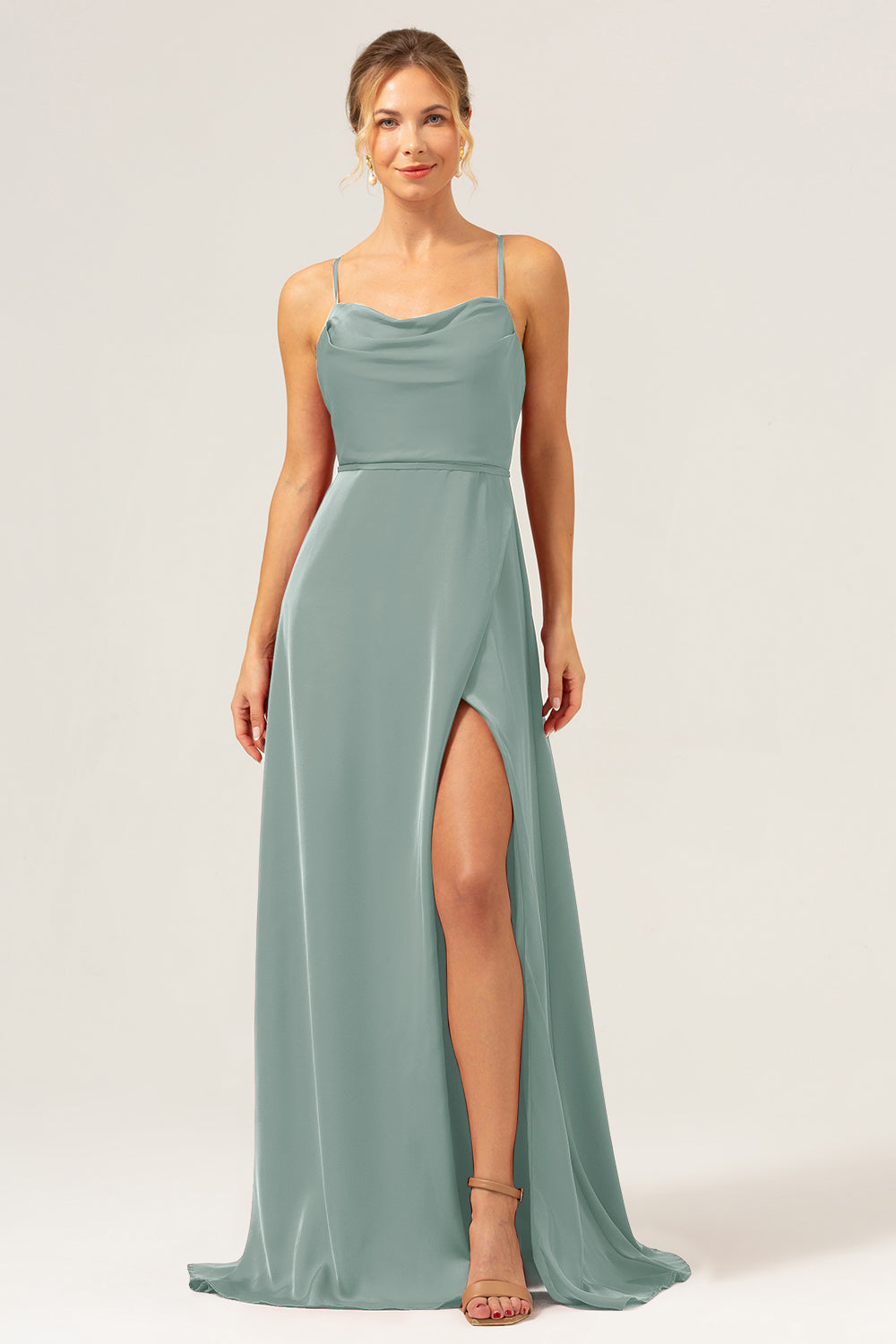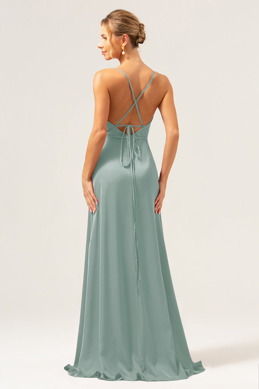 Elfenben Slida Spaghetti Remmar Rynkad Lång Satin Brudtärna Klänning Med Slits