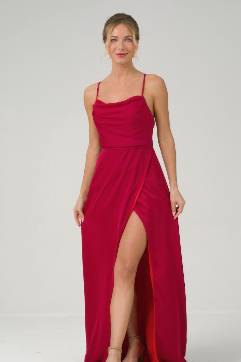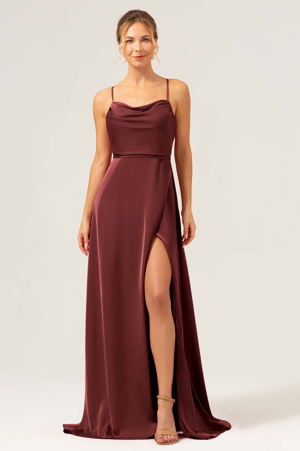 Mörkröd A Line Spaghetti Remmar Rygglös Satin Lång Brudtärna Klänning Med Slits