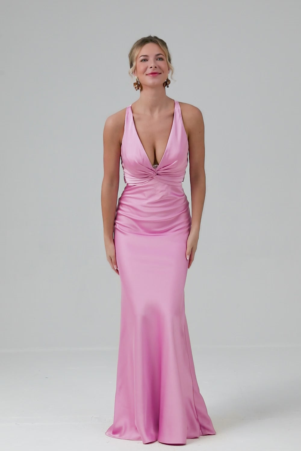 Rosa Sjöjungfru V-hals Rynkad Satin Lång Brudtärna Klänning med Snörning Upp Tillbaka