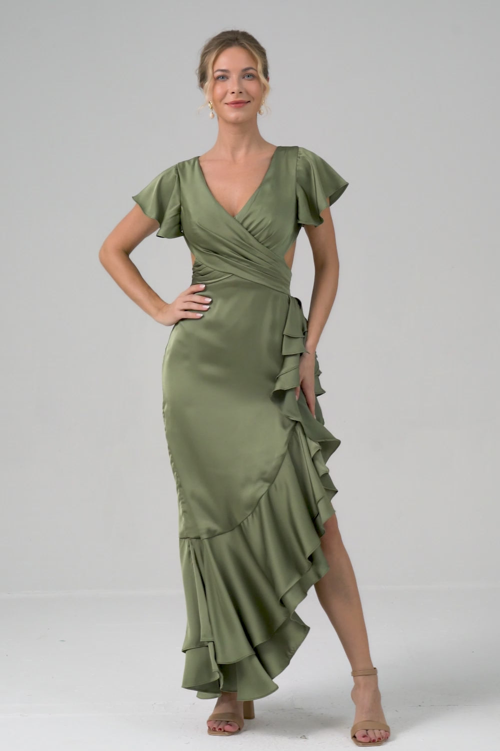 Oliv A Line V-ringad Satin Asymmetrisk Brudtärna Klänning med Ruffle Slits