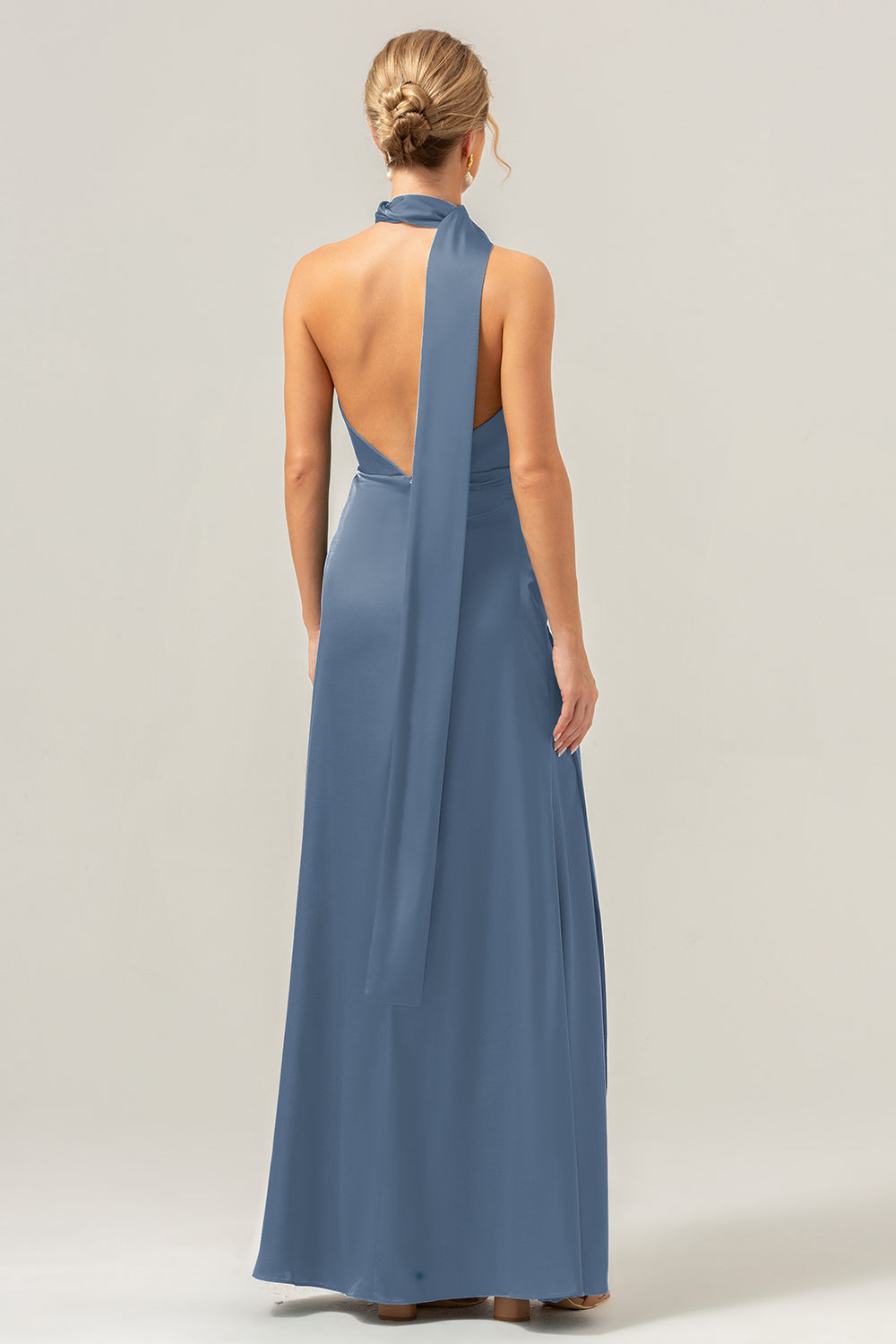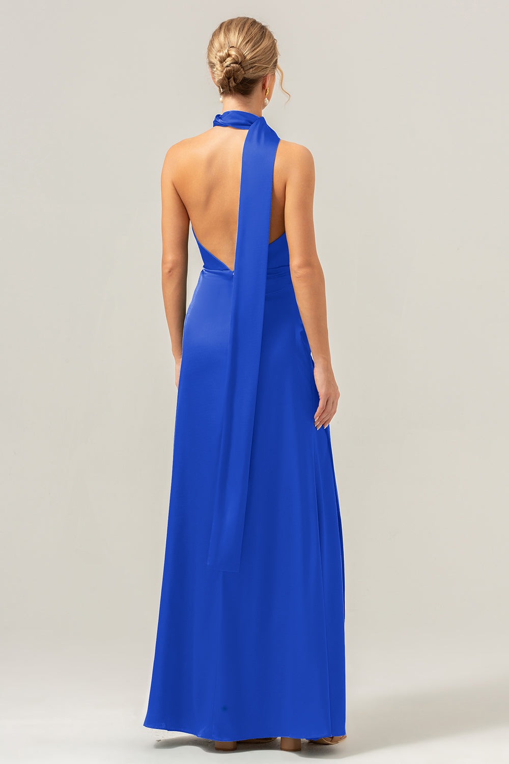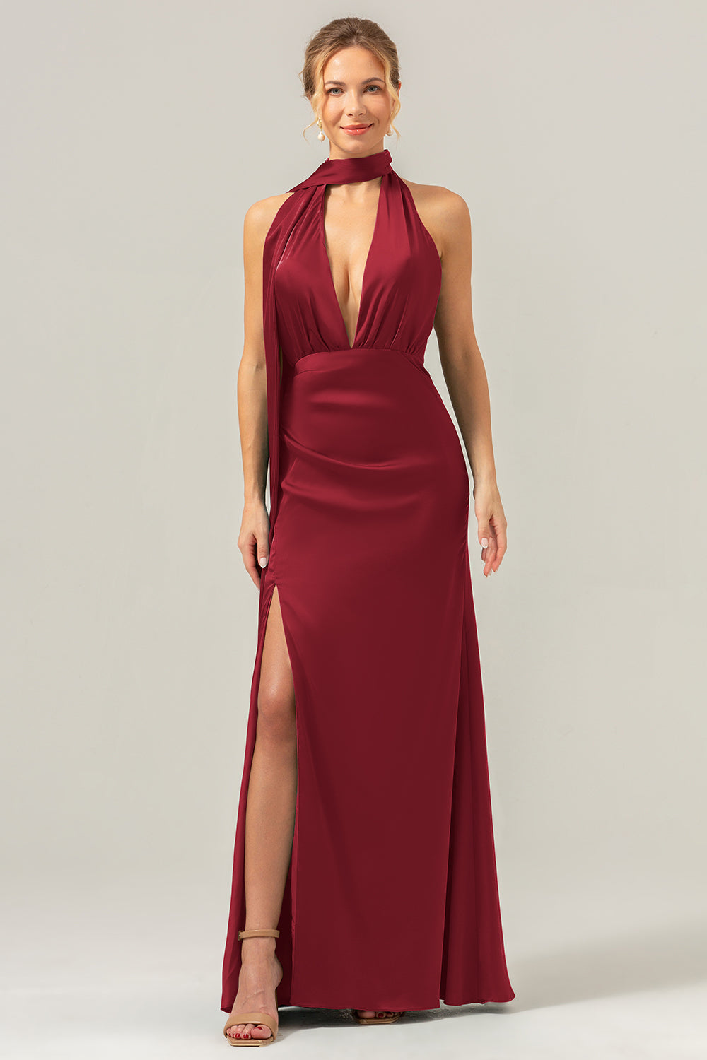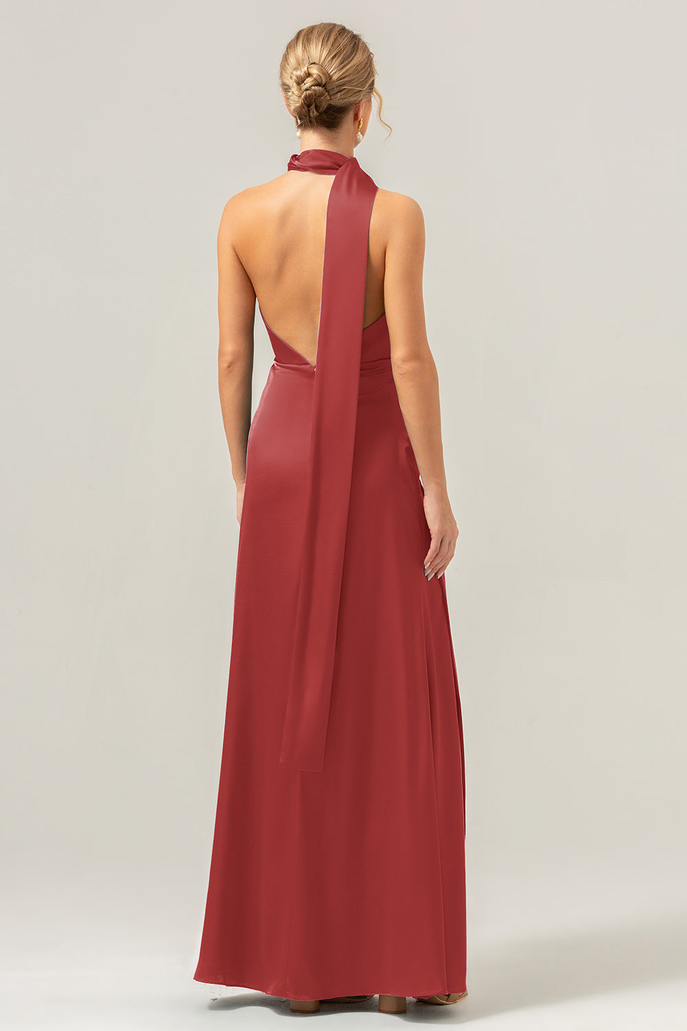 Rosa En linje V-ringad Rygglös Satin Lång Brudtärna Klänning med Slits