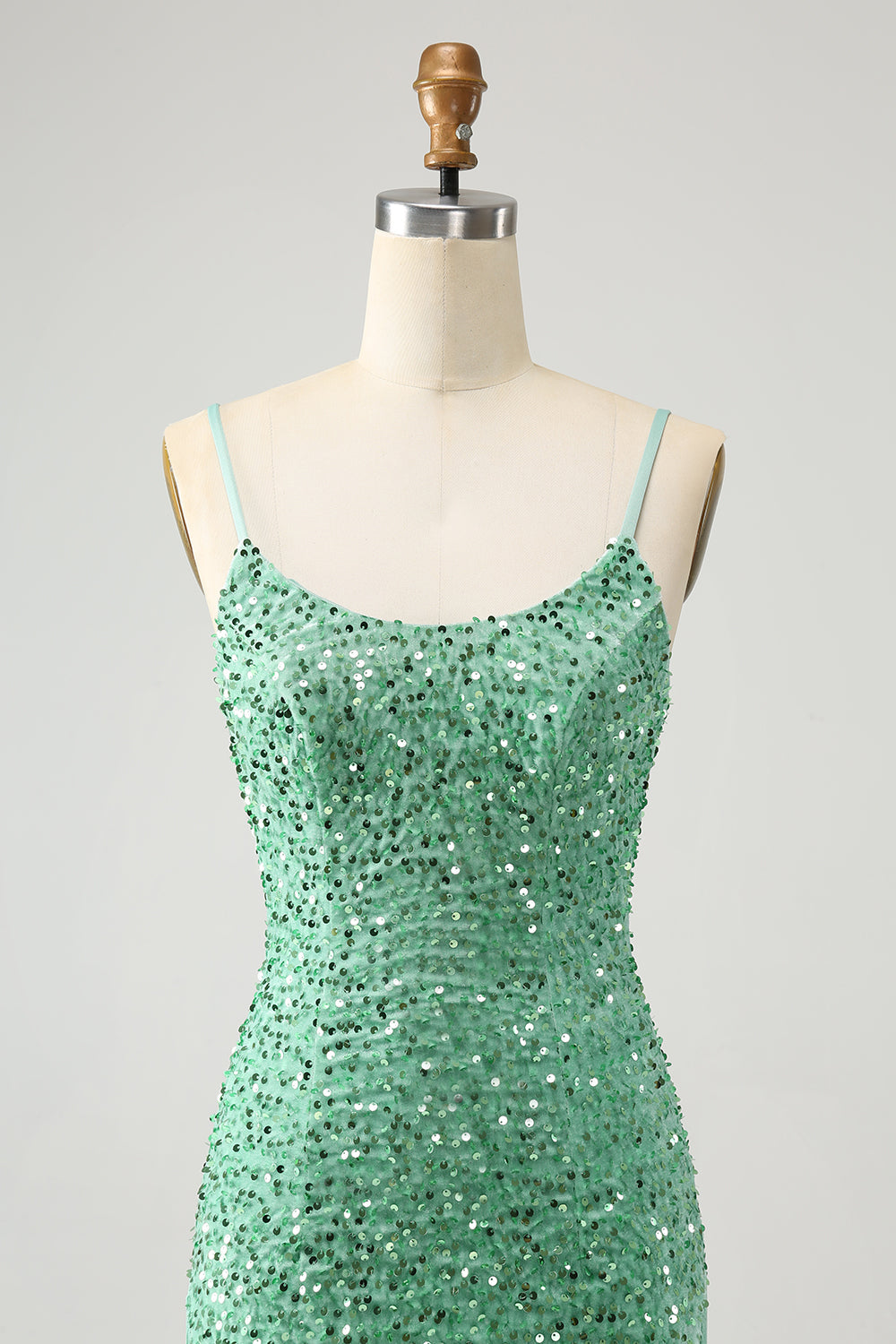 Fuchsia Paljetter Spaghetti Straps Kort Homecoming Klänning med Tofsar