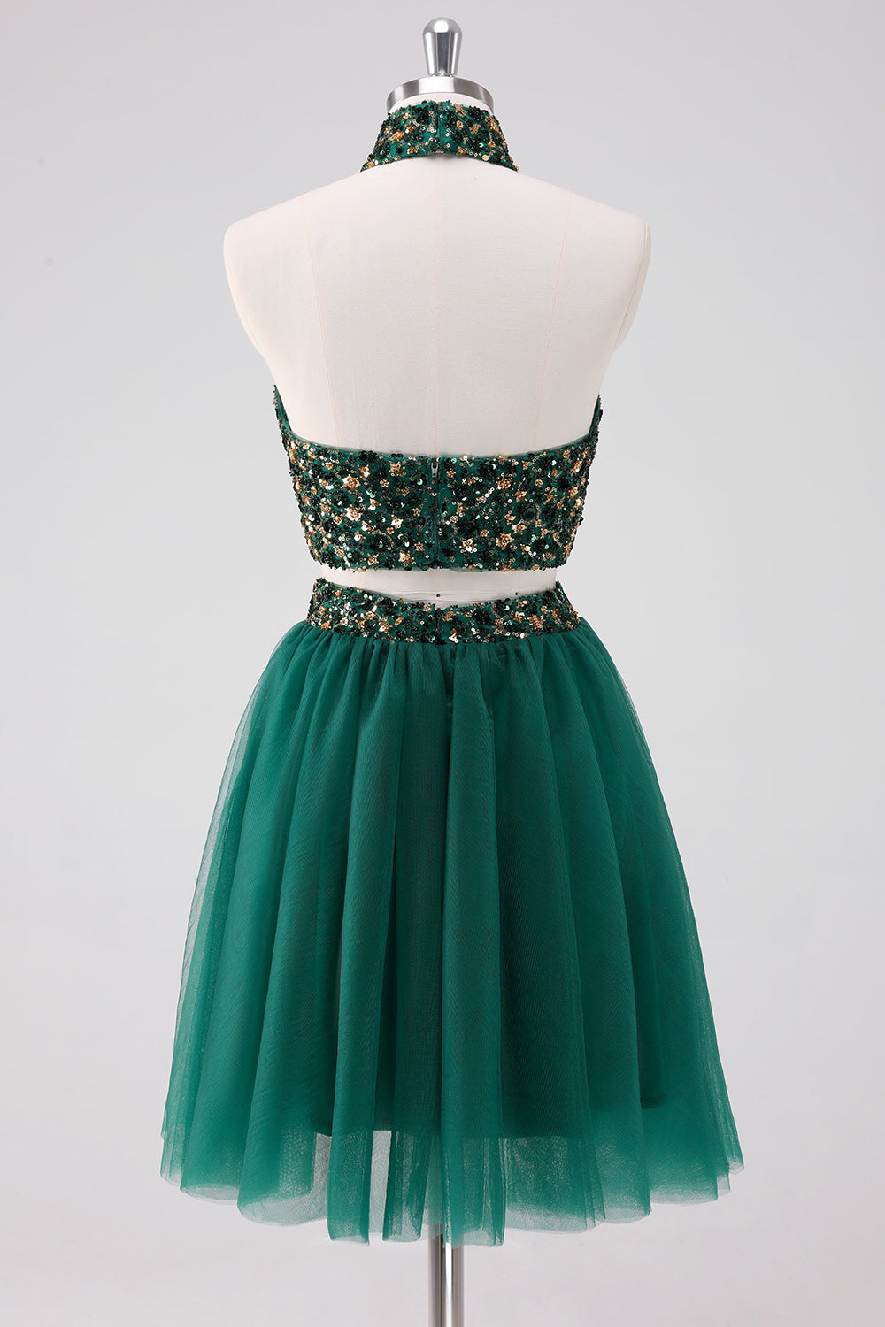 Glittrande A-linje Mörkgrön Halter Kort Homecoming Klänning med Paljetter