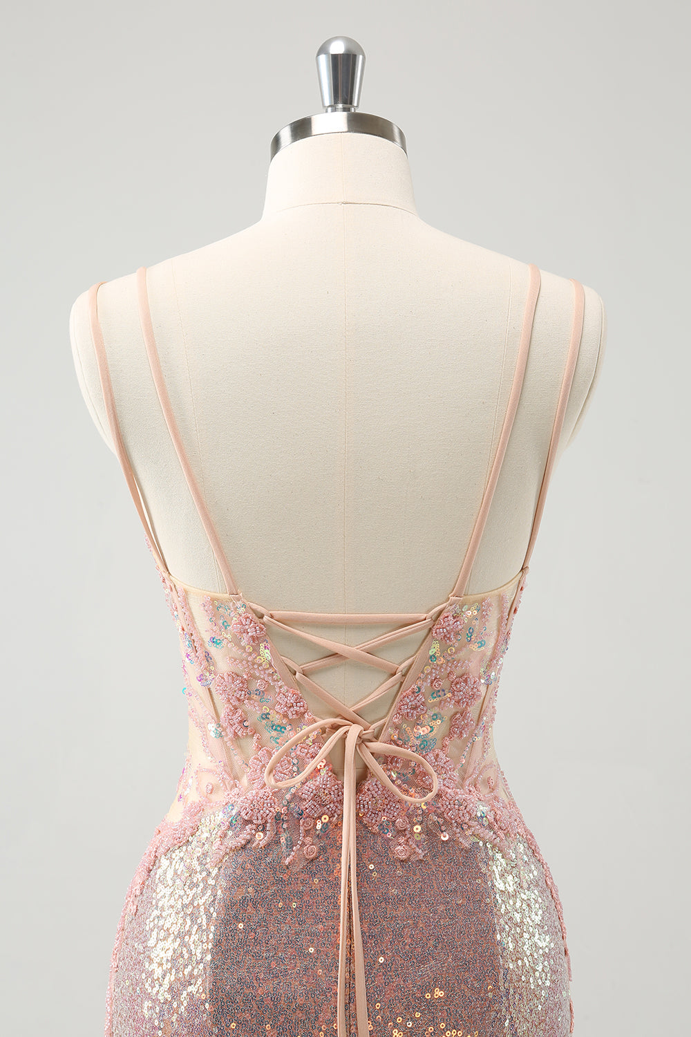 Glittrande rodnad Spaghetti remmar Tight Kort Homecoming Klänning med Snörning Tillbaka