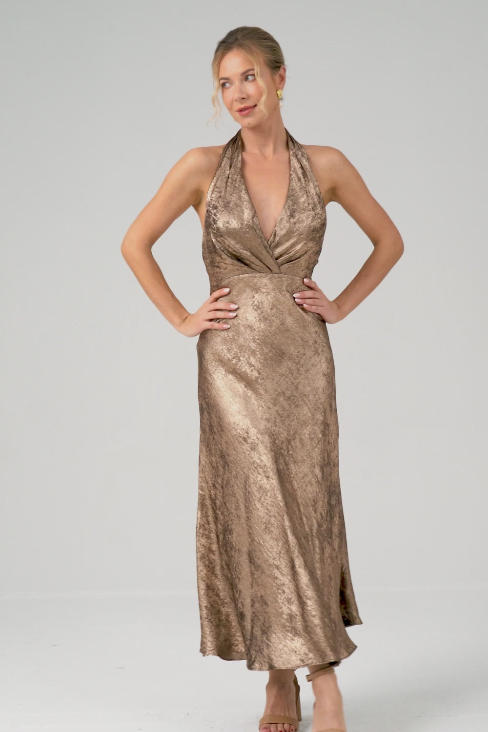 Gyllene Halter Neck Sjöjungfru Satin Midi Cocktail Klänning