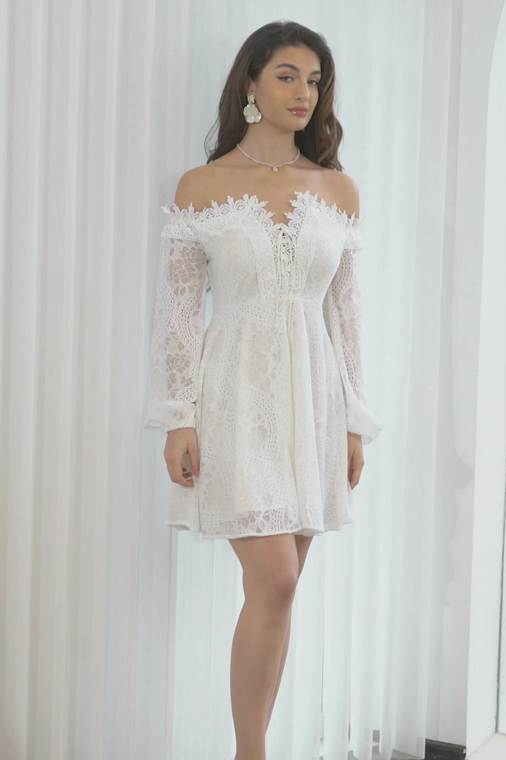 Off the Shoulder Spets Liten Vit Klänning med Långa ärmar