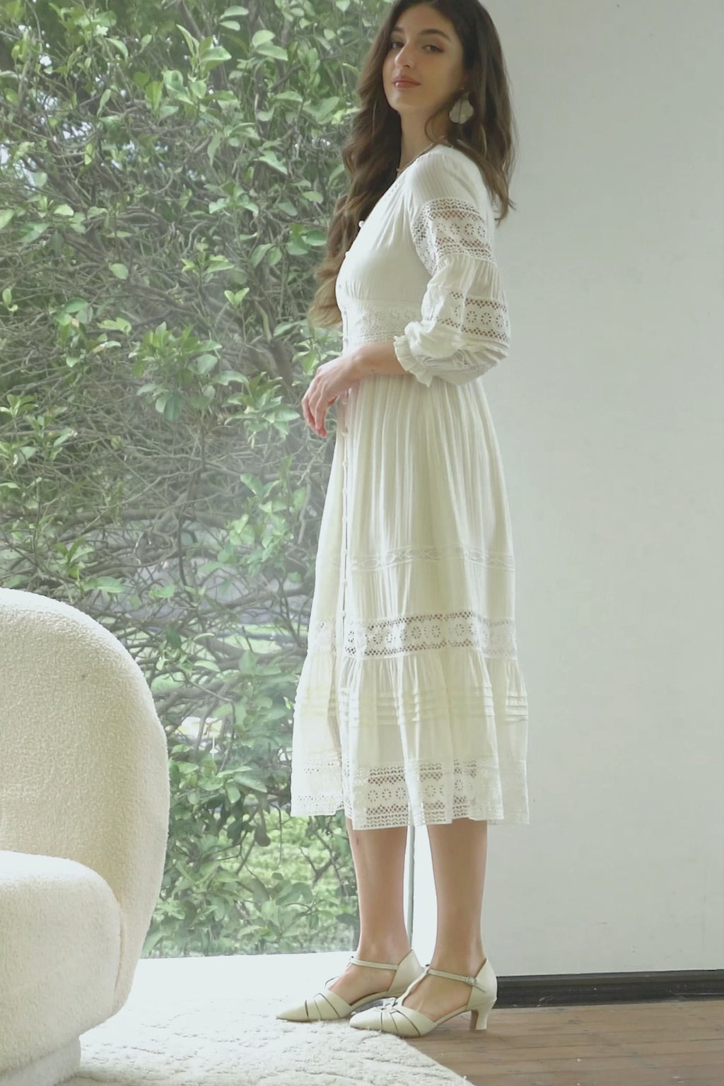 Te-Lång Spets Liten Vit Klänning med Långa ärmar