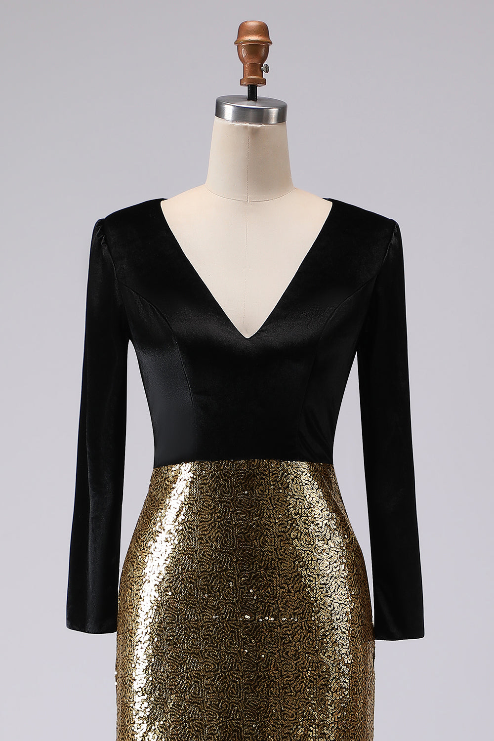Glittrande Guld och Svart V-ringad Fodral Lång Formell Klänning