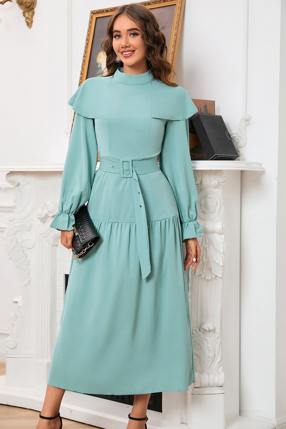 A Line Grön Långärmad Avslappnad Klänning Med Bälte