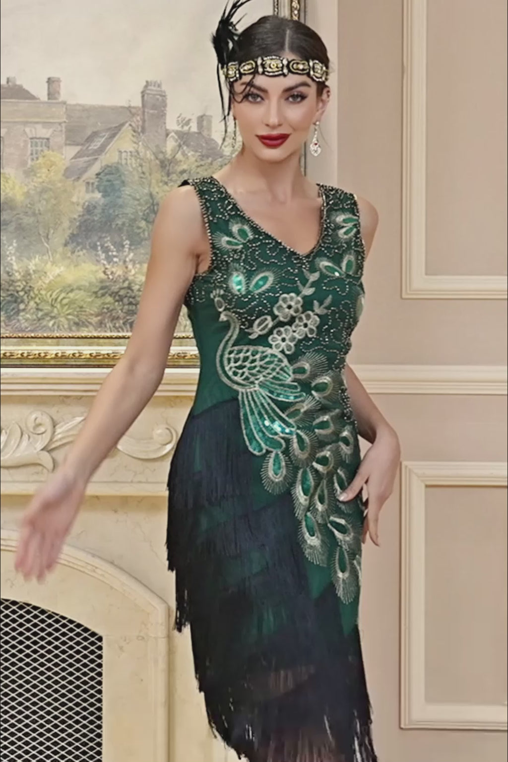 Glittrande svarta paljetter fransad 1920-tals flapperklänning