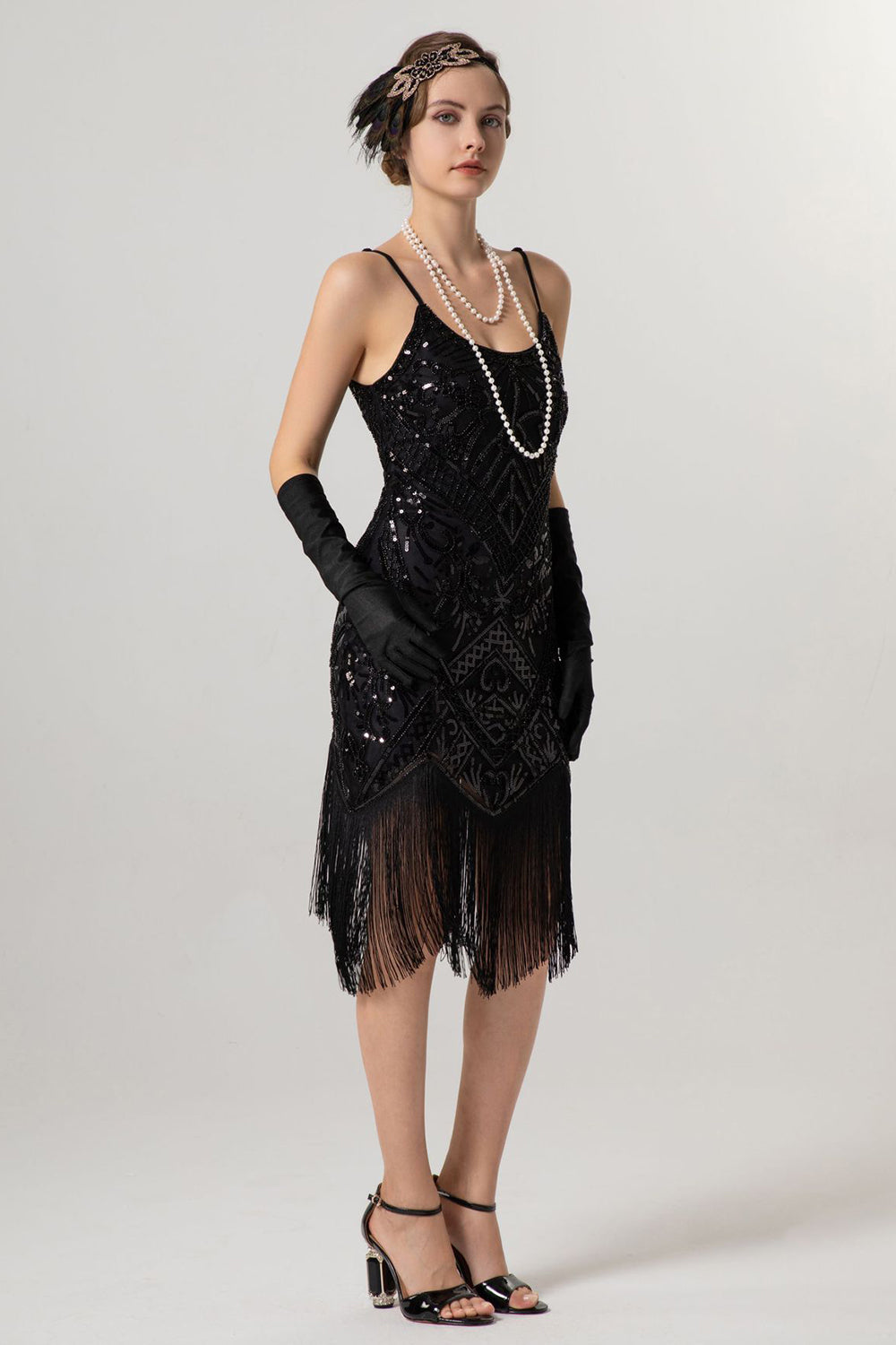 Svart Gyllene Slida Paljett 1920-talet Flapper Klänning med tofsar