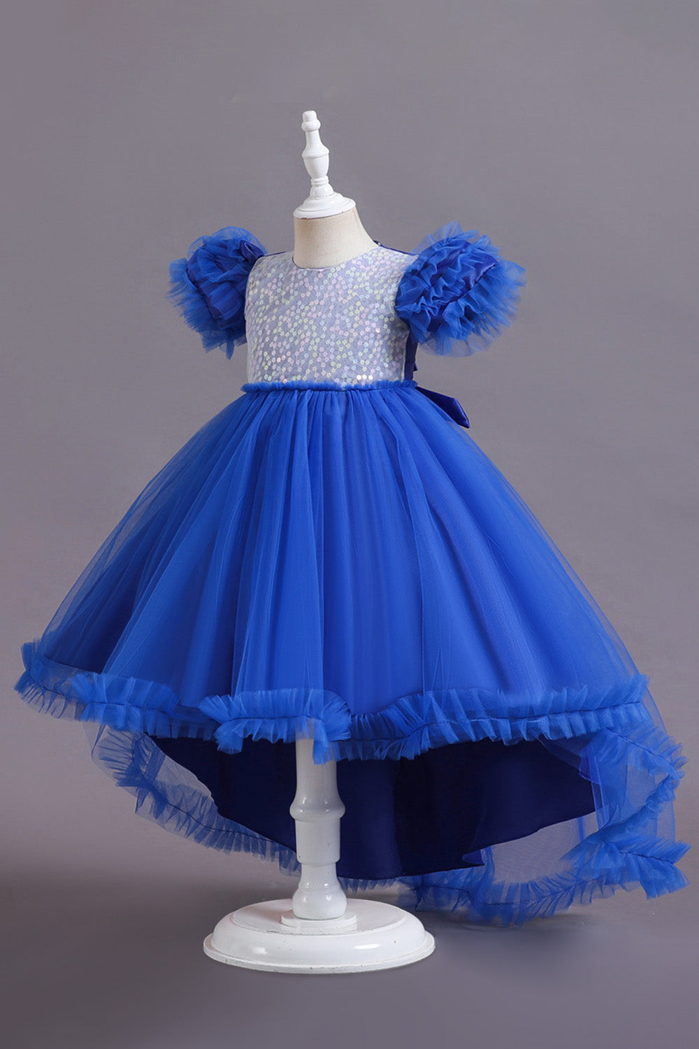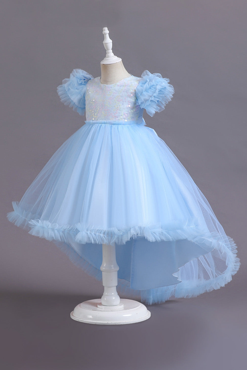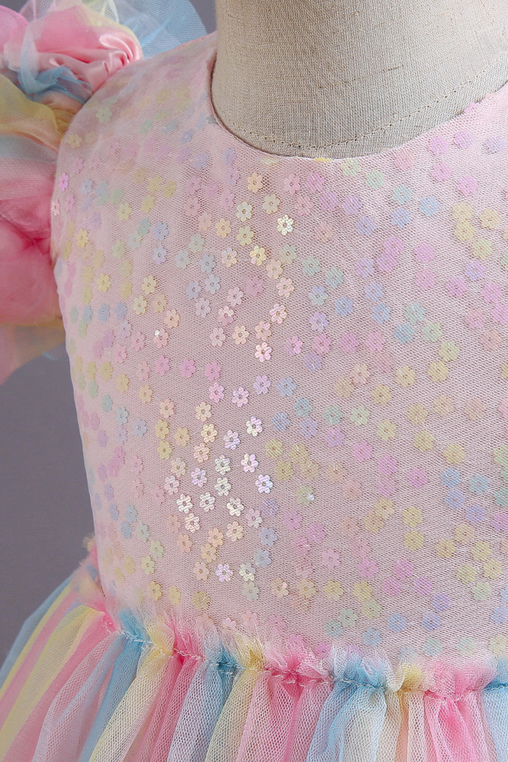 En linje Tyll Rosa paljetter Puff ärmar Flickor Klänningar med Rosett