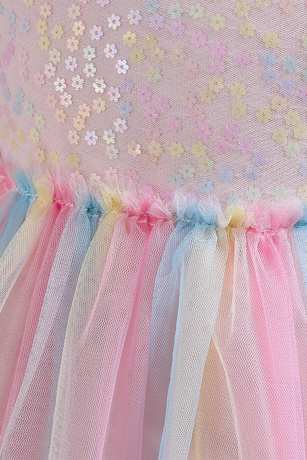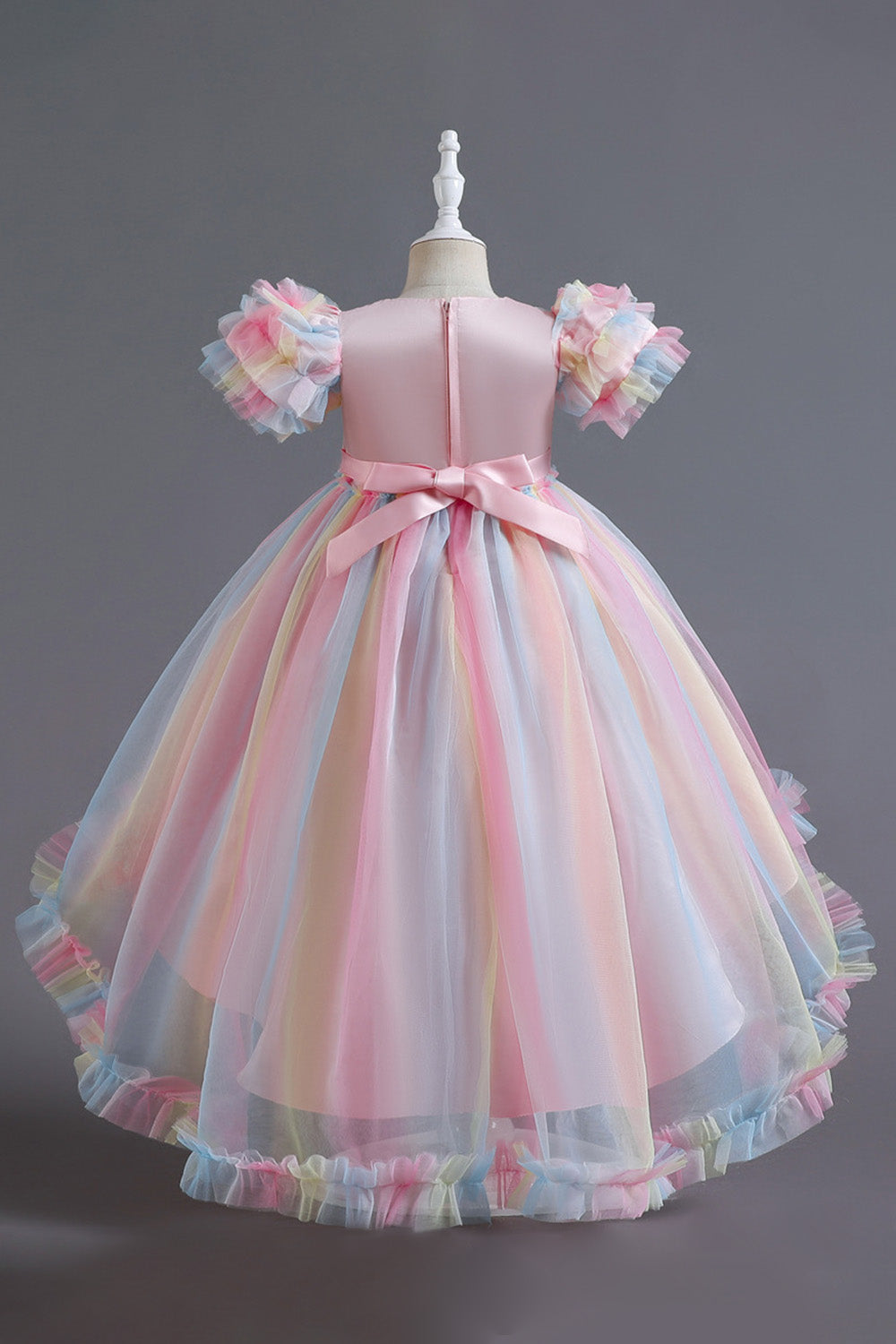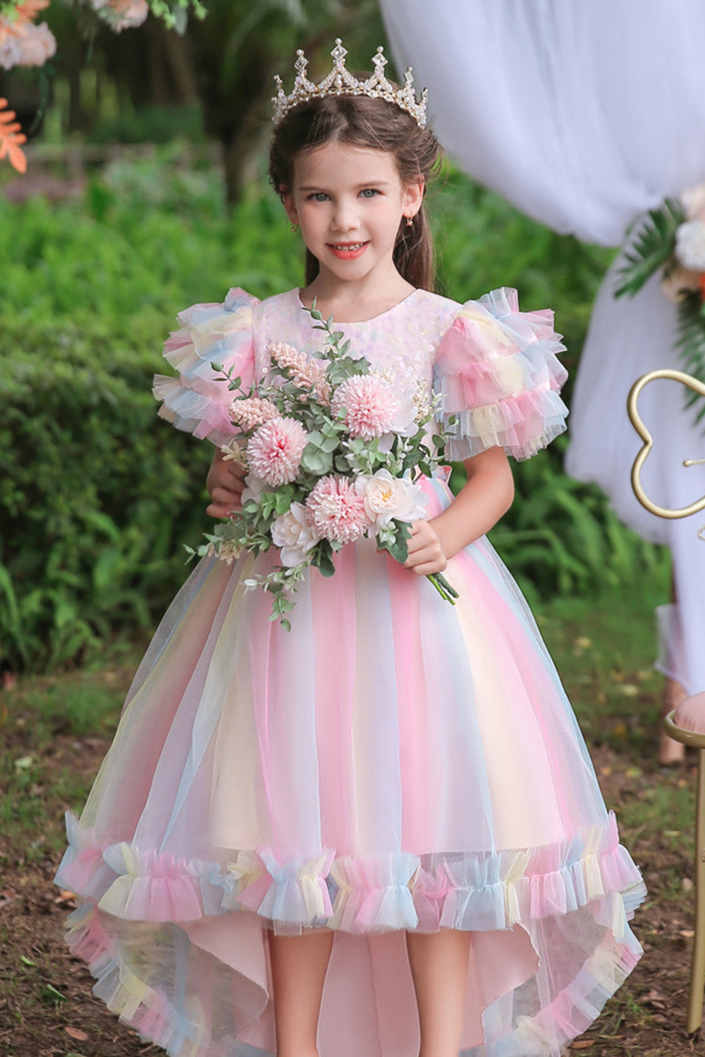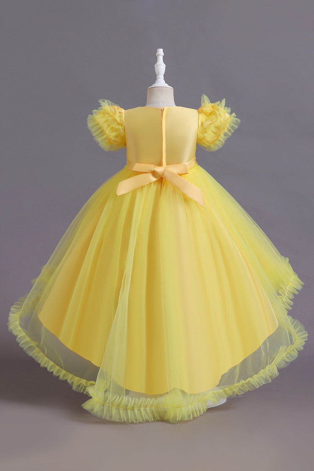 En linje Tyll Rosa paljetter Puff ärmar Flickor Klänningar med Rosett