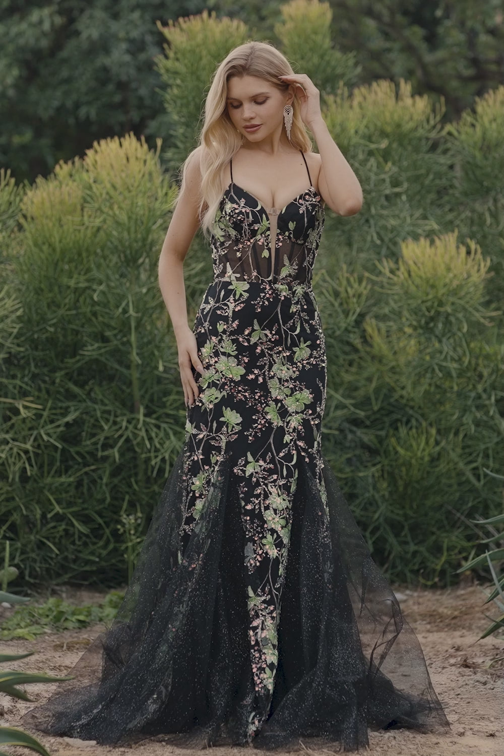 Gul Sjöjungfru Korsett med Blommig Spets Bak Lång Balklänning med Paljetter