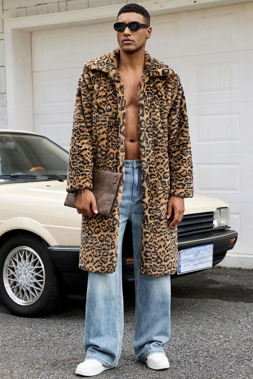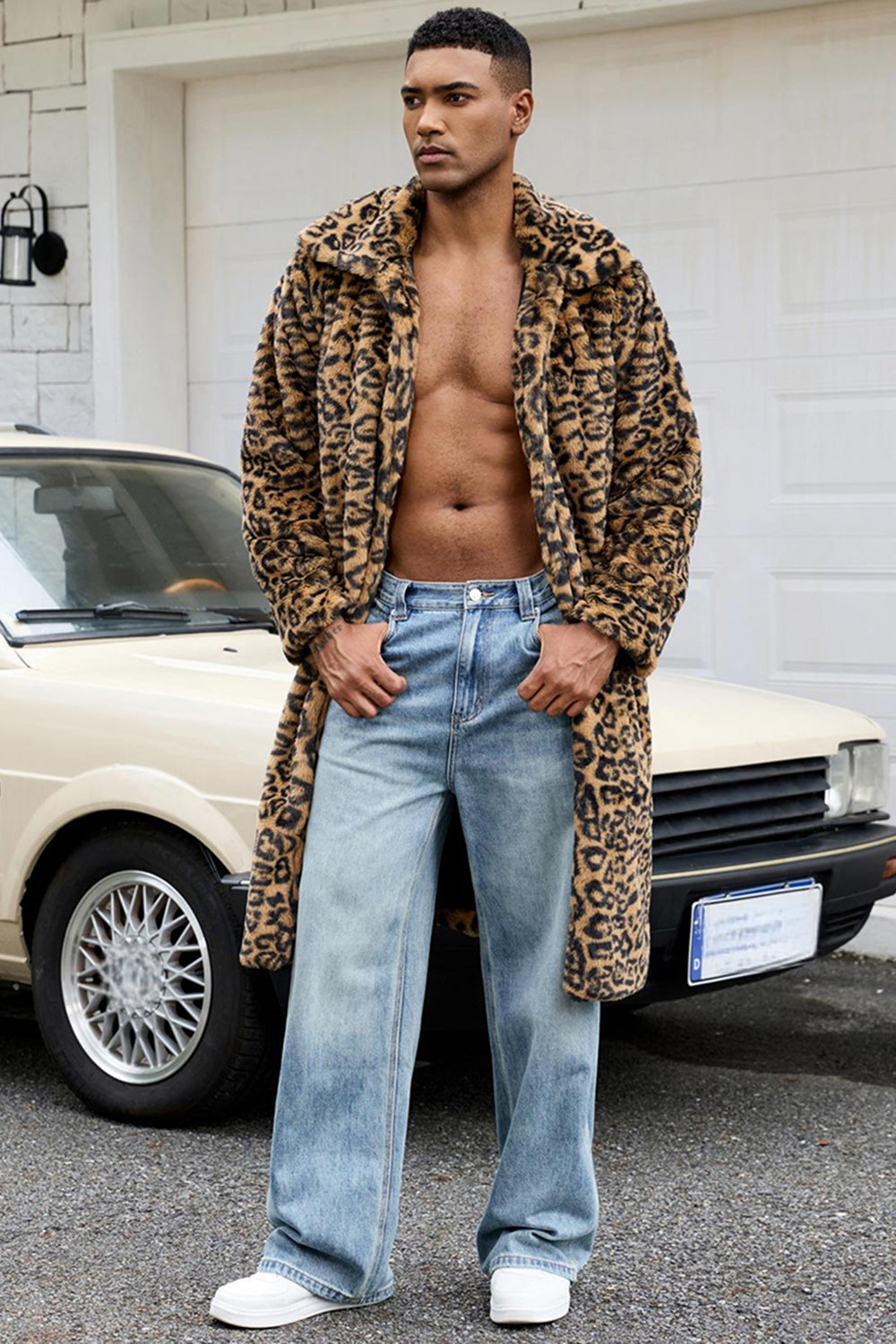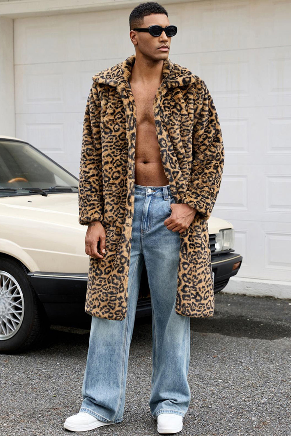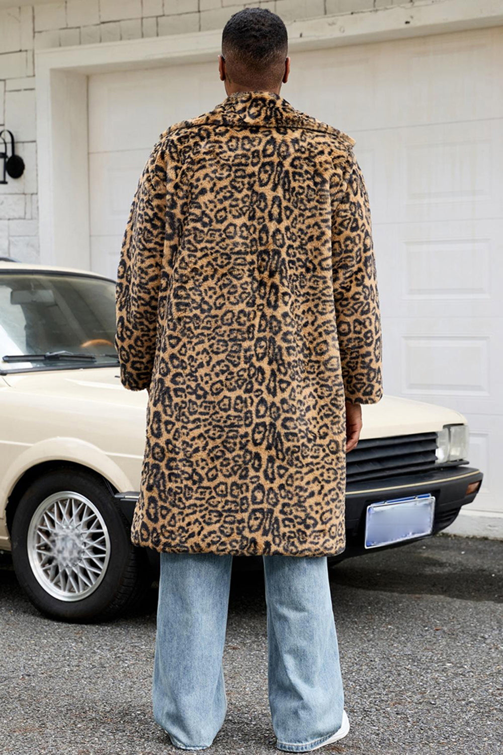 Gul leopardpäls öppen framtill värme herrvinterkappa