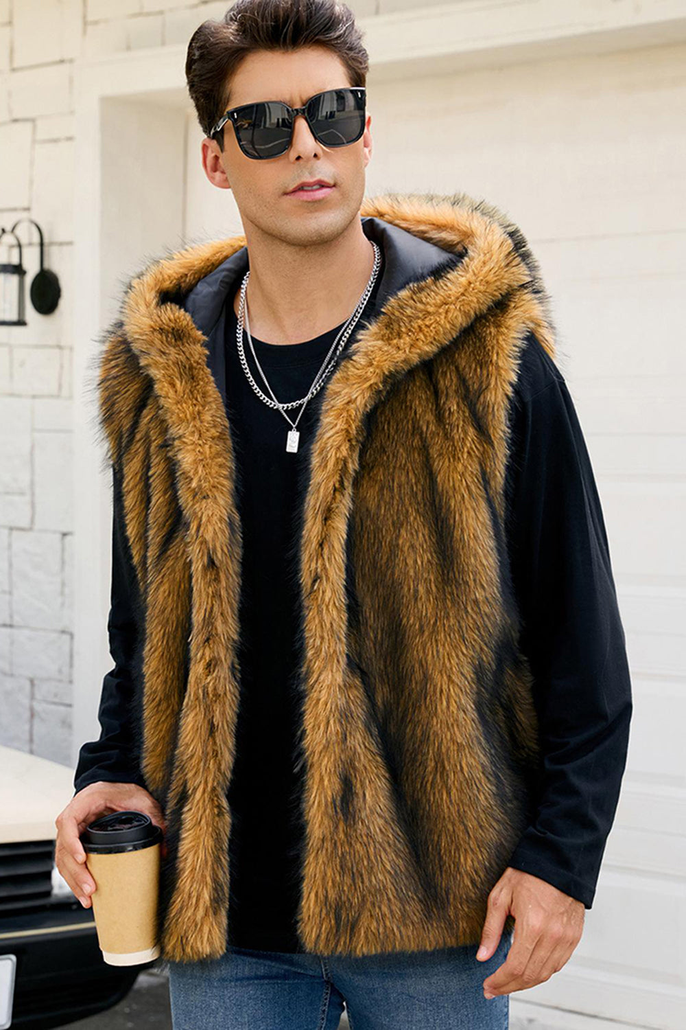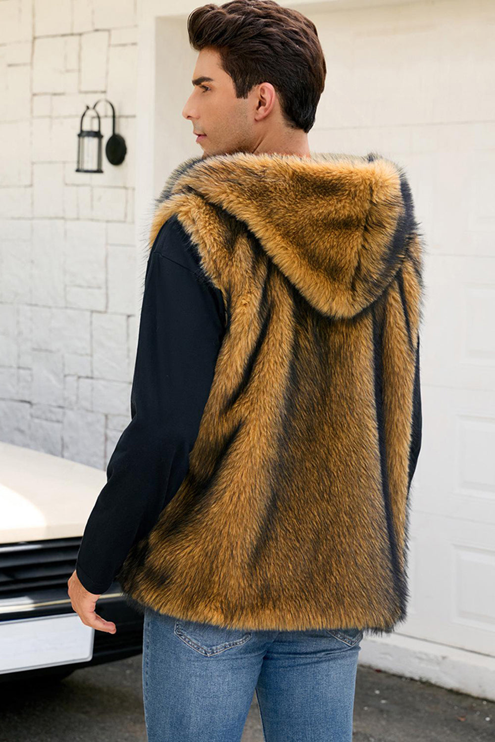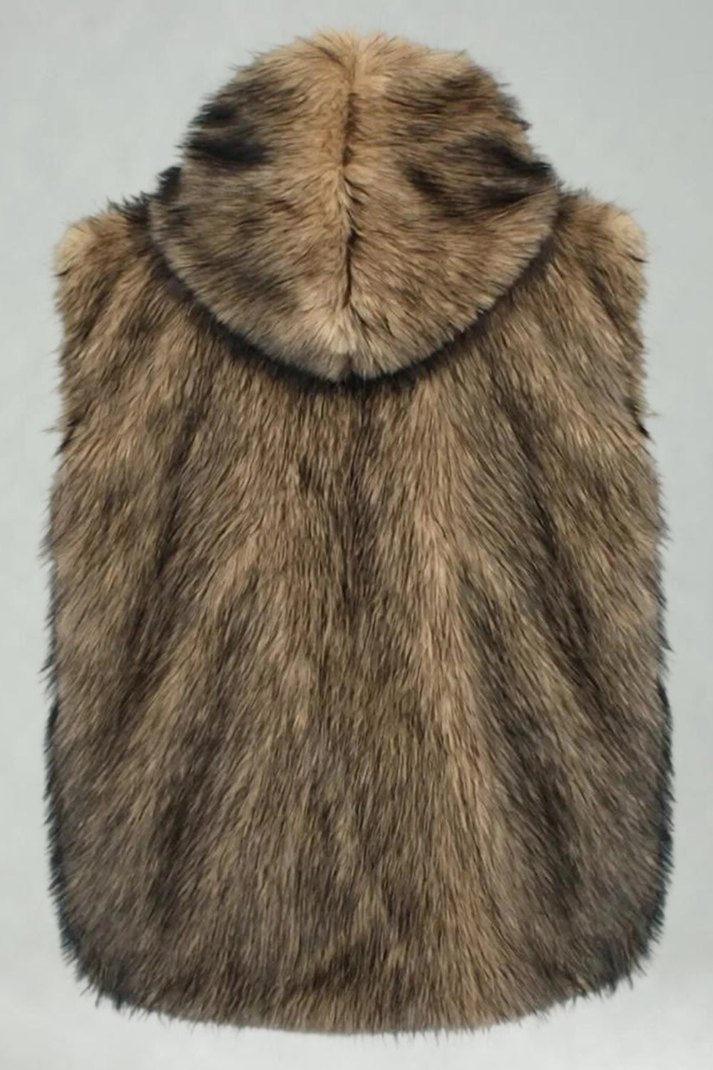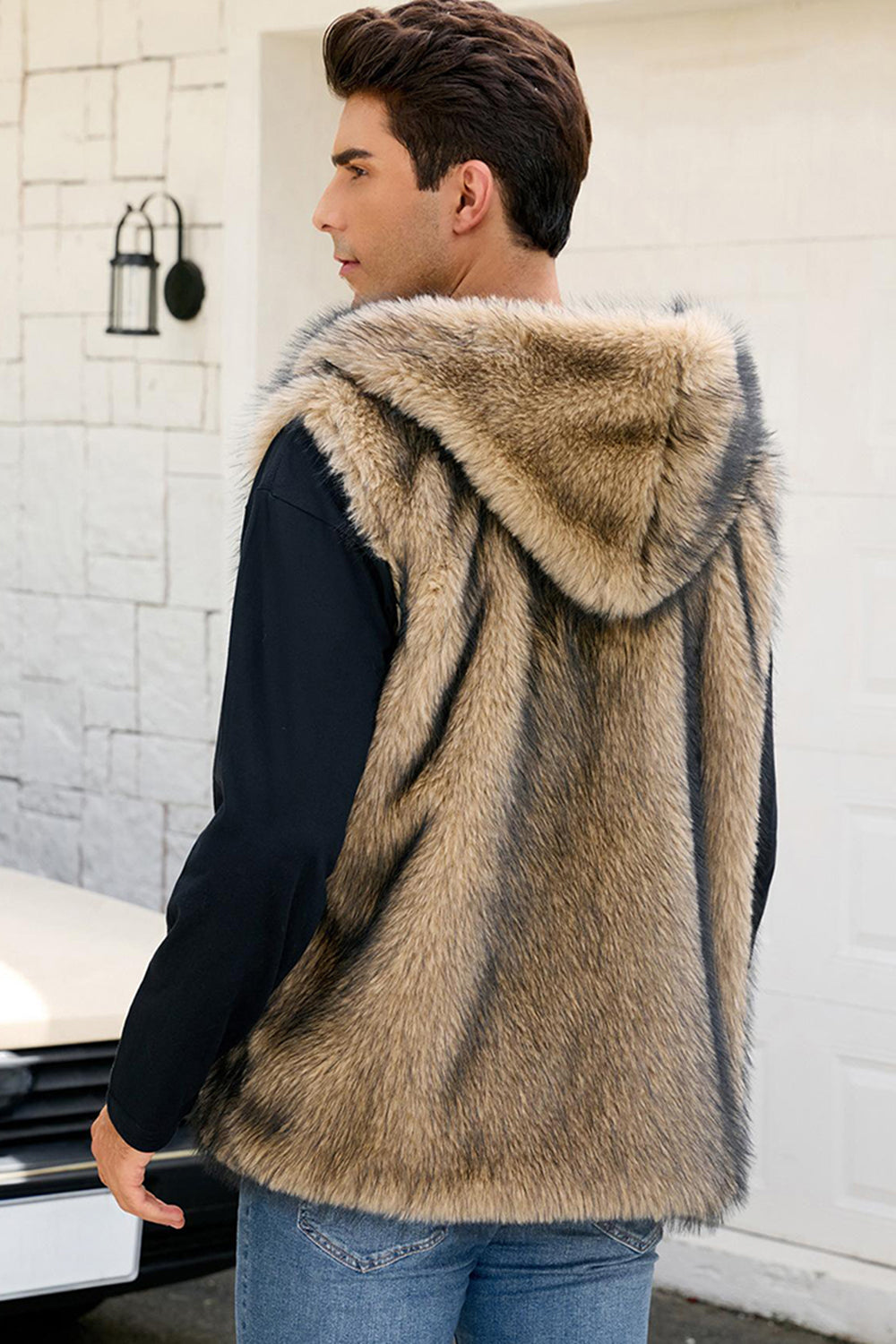 Herrarnas kamel-fuskpälsväst med huva