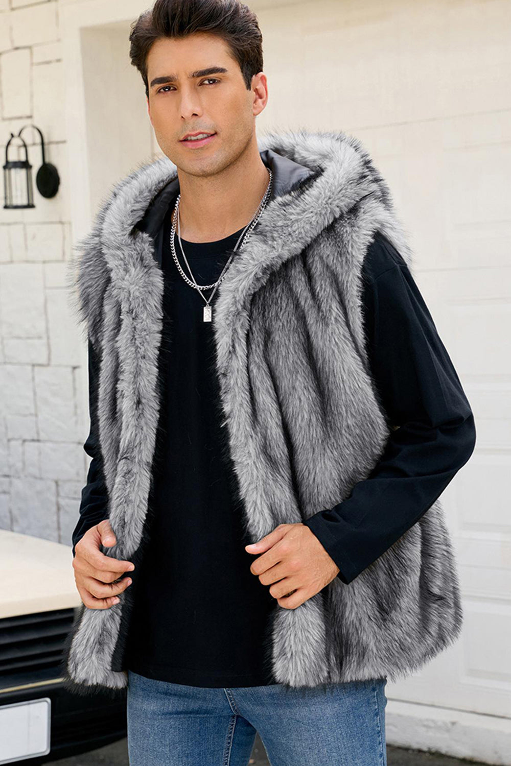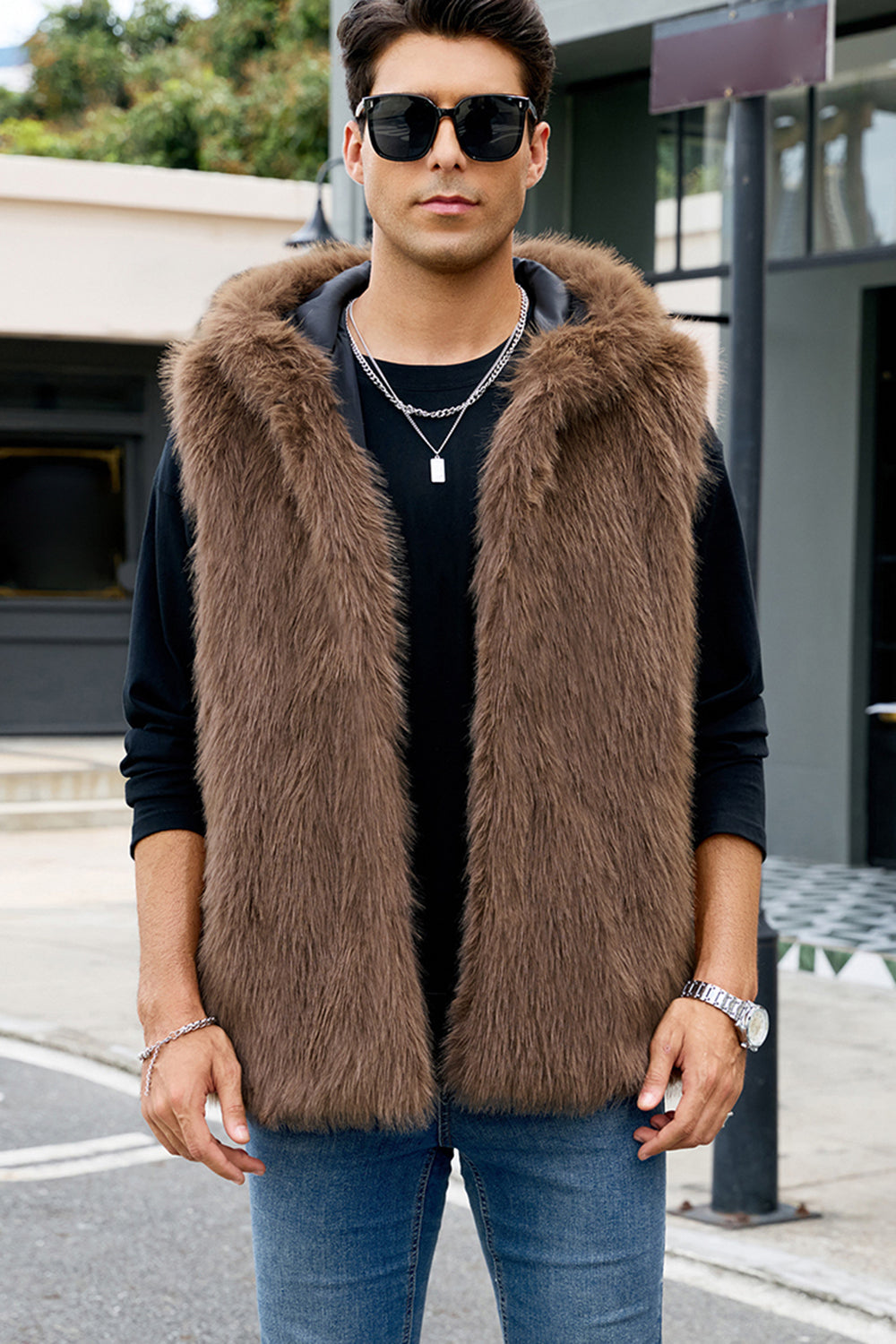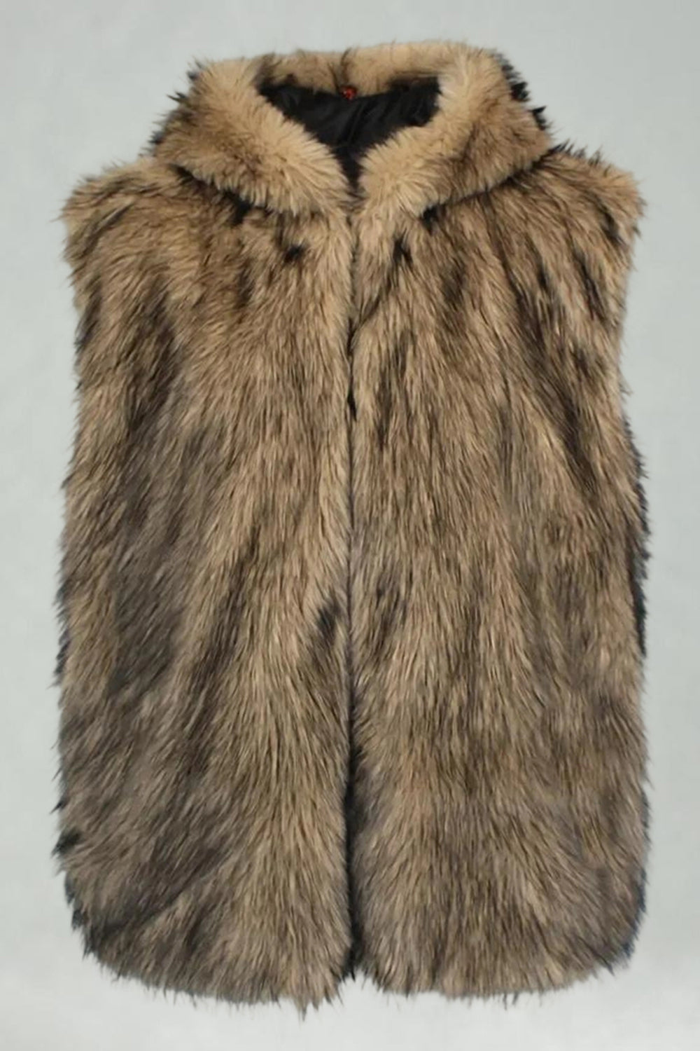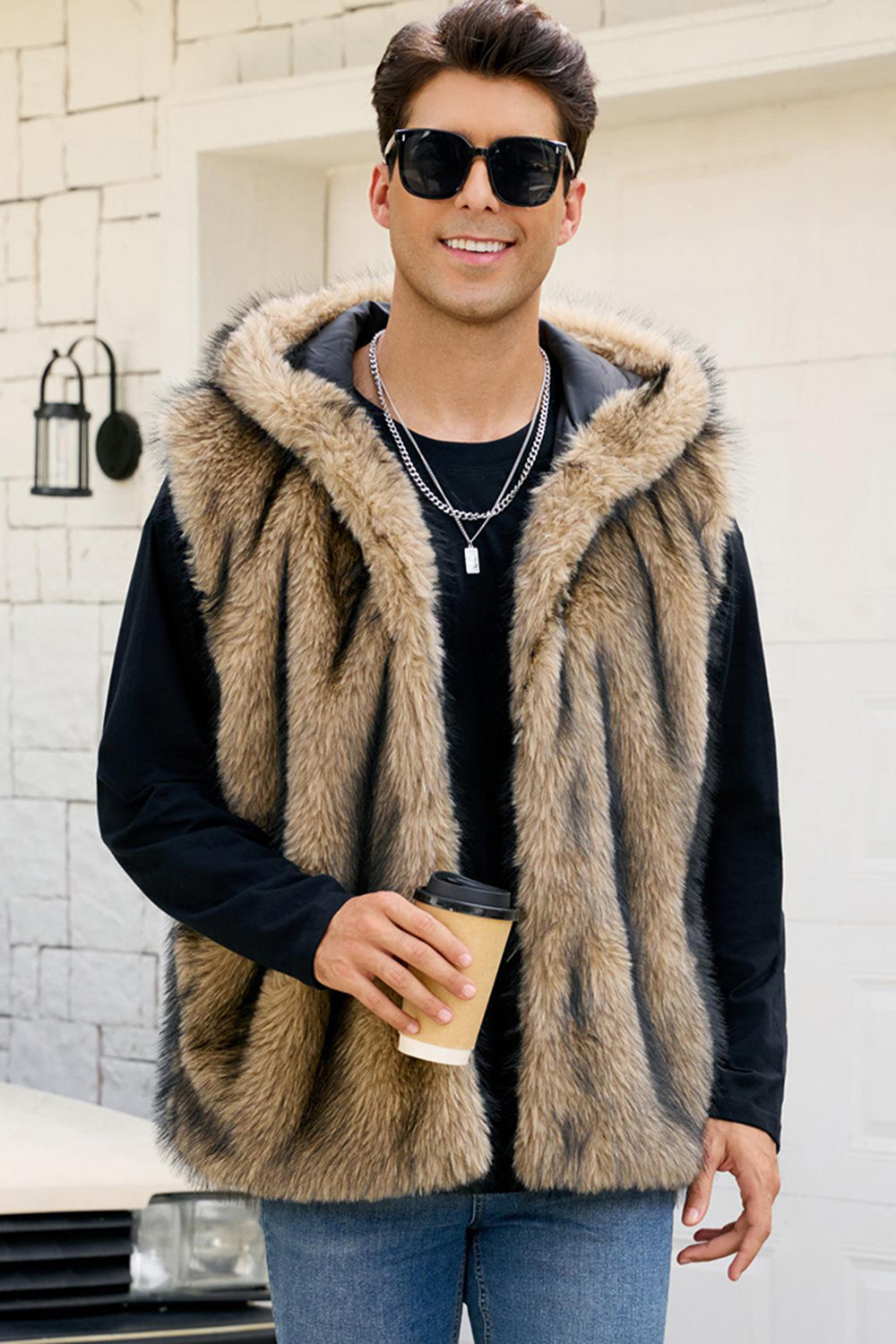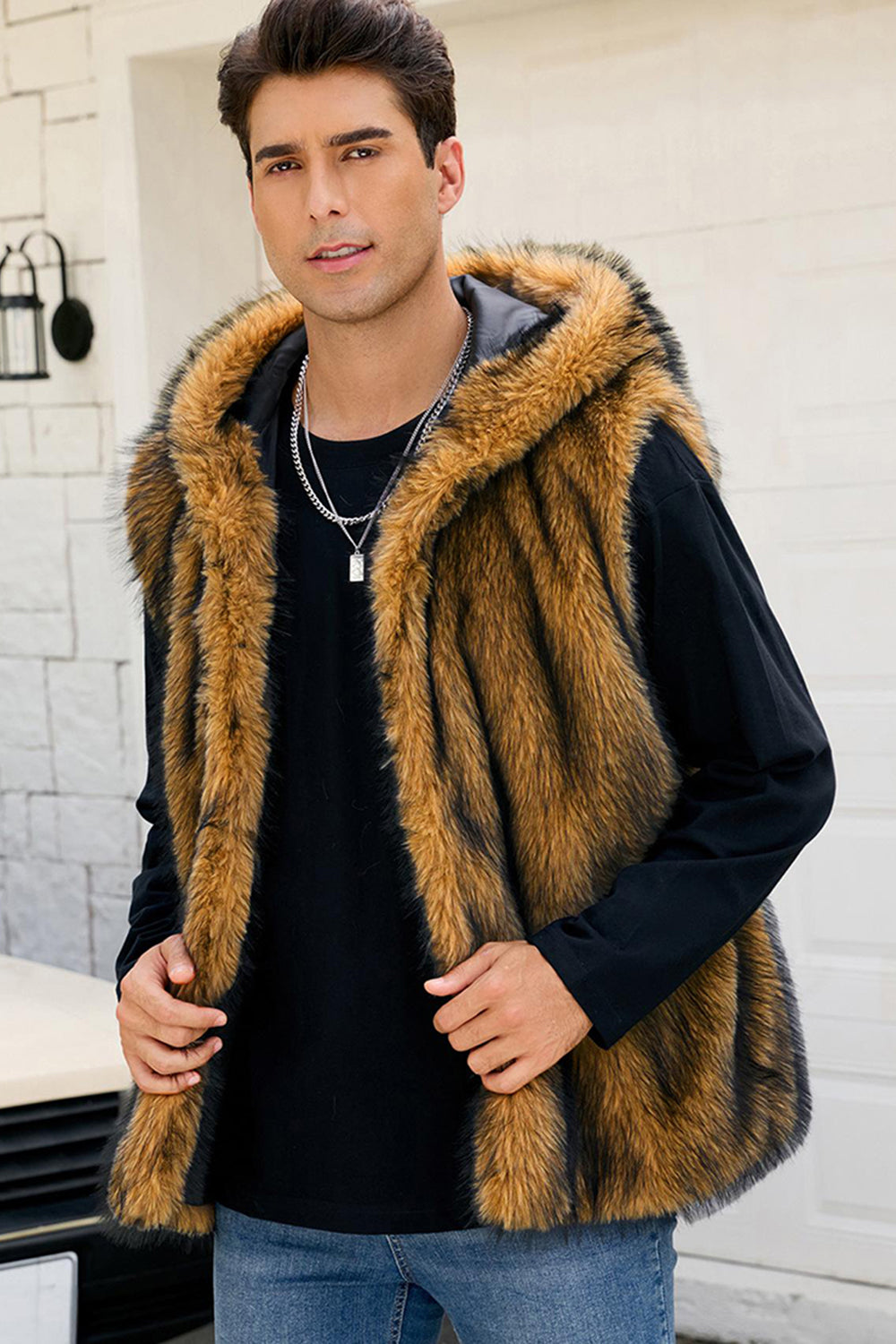 Herrarnas kamel-fuskpälsväst med huva