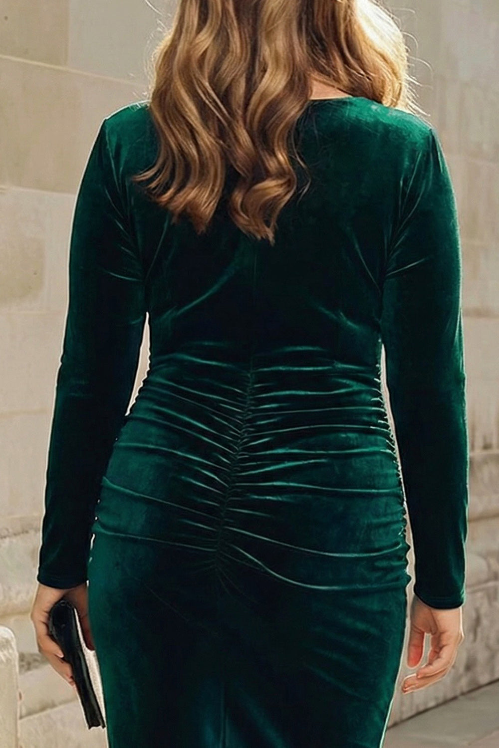 Plusstorlek mörkgrön sheath velvet rynkad midi-arbetsklänning med långärmat