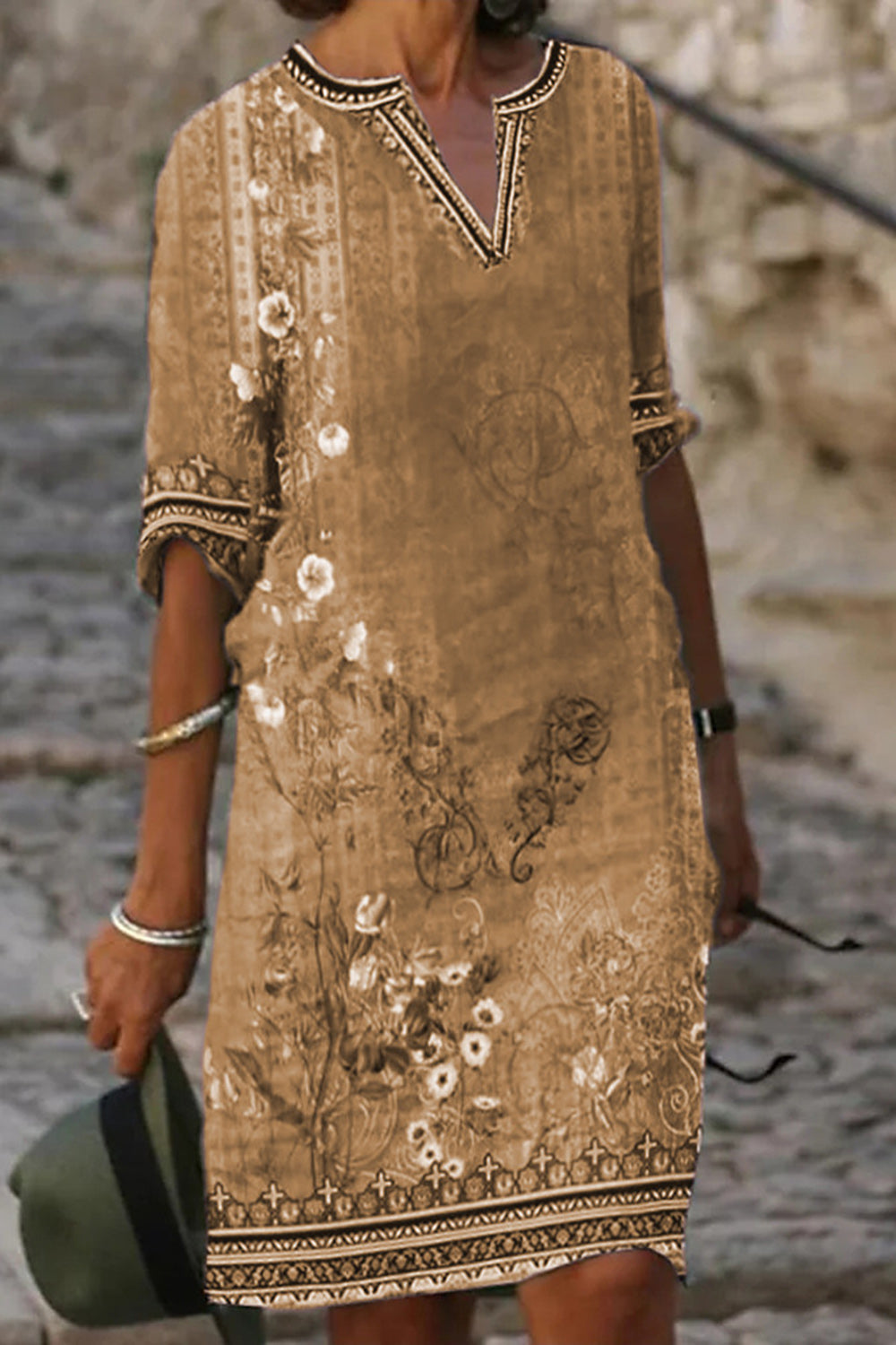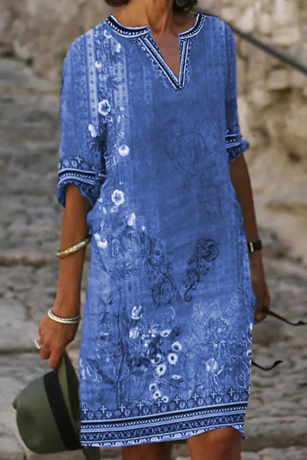 Etnisk tryckt kortärmad knälängd avslappnad klänning