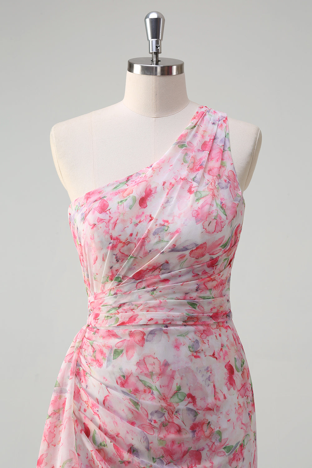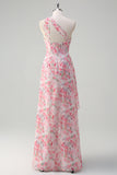 Rosa Blommig Ena Axeln Lång Balklänning Med Slits