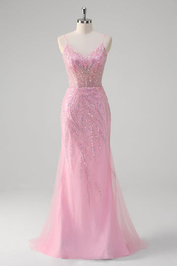 Rosa Sjöjungfru Spaghetti Remmar Paljett Korsett Lång Balklänning
