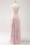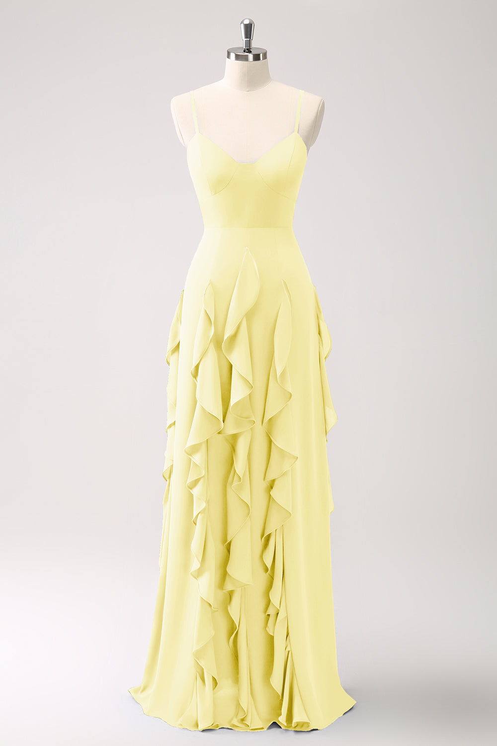 A-linje Mörkblå Spaghetti Remmar Brudtärna Klänning med Volanger