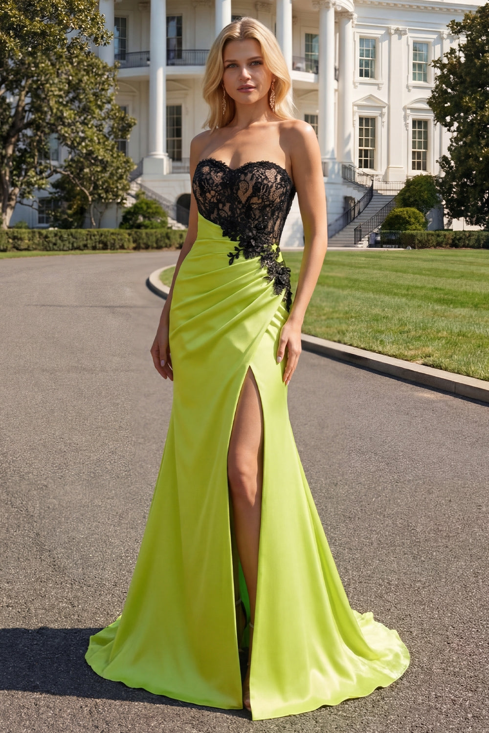 Axelbandslös sjöjungfru svart grön applikerad spetsklänning med lång balklänning med slits
