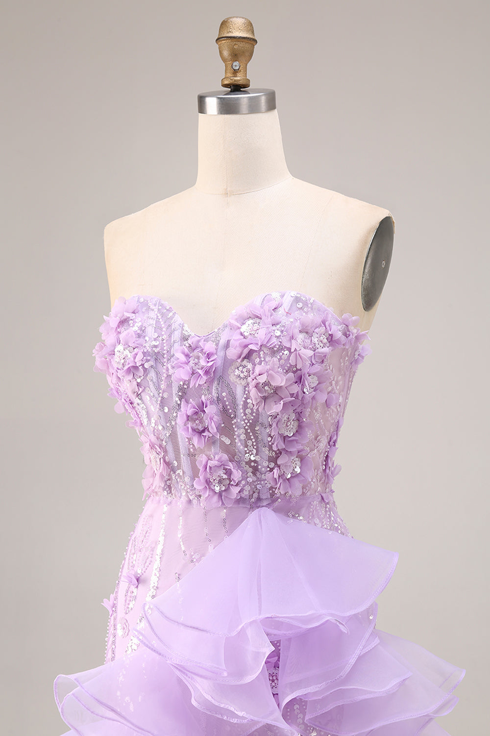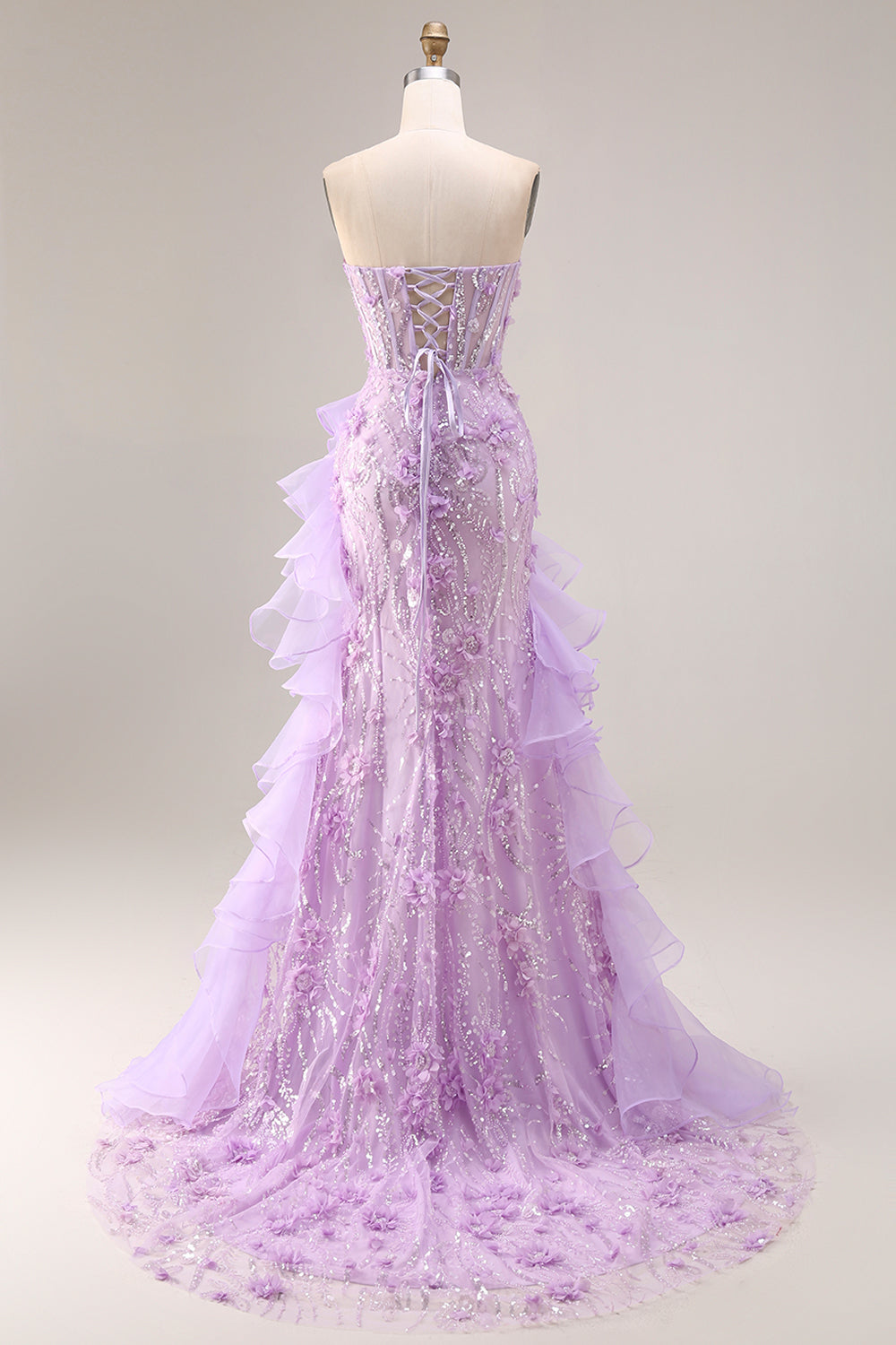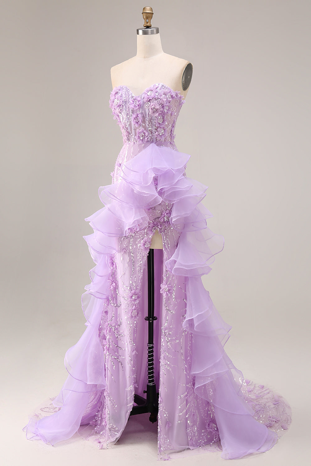Glittrande lila Sweetheart med volang i slidan med lång balklänning med slits och 3D-blommor